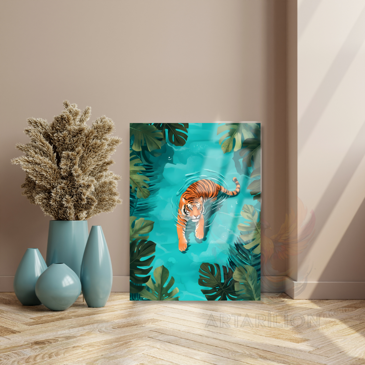 Swimming Tiger Unbreakable Glass Painting Modern Home Decor Wall Painting