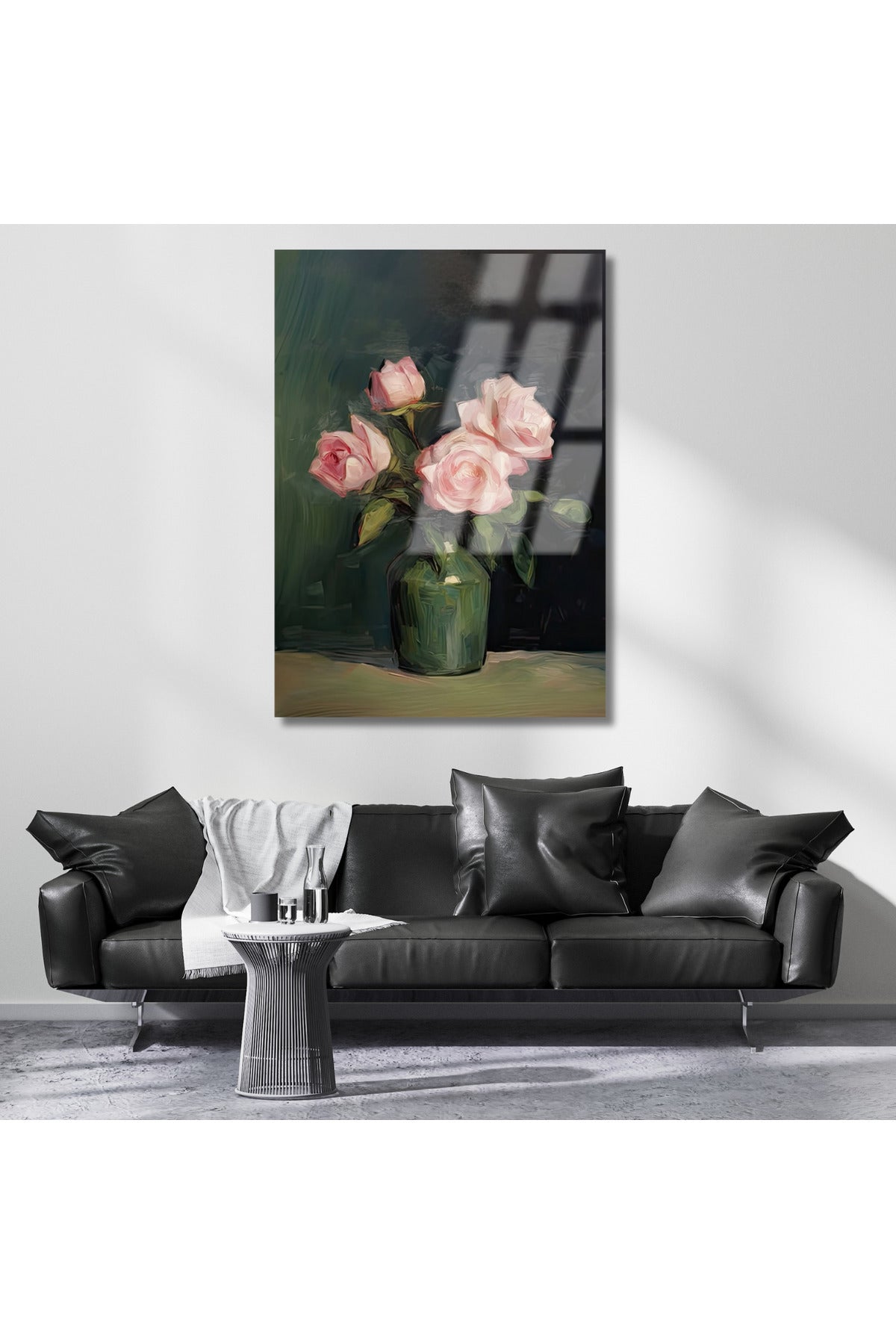 Vazodaki Gül Yağlı Boya Görünümlü Kırılmaz Cam Tablo Klasik Salon Tablosu