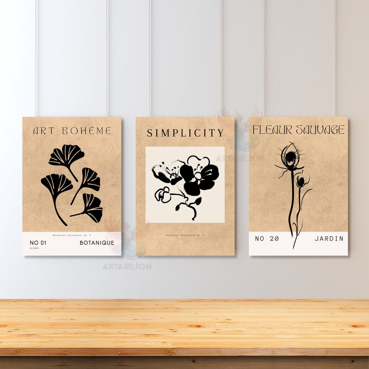 Set of 3 Canvas Paintings Minimalist Boho Abstract Plants Wall Painting Living Room Painting Bohemian Painting