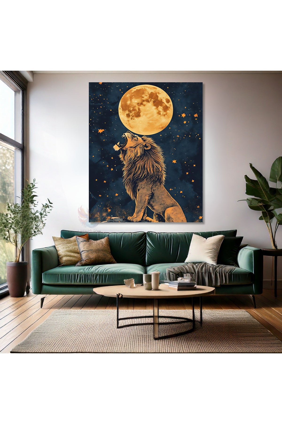 Kükreyen Aslan Tablosu Kanvas Tablo Ay ve Aslan Duvar Tablosu