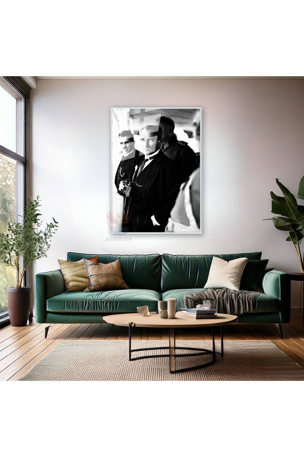 Dürbün Tutan Atatürk Görseli Metal Çerçeveli Cam Tablo Siyah Beyaz Atatürk Görseli Dikey Tablo