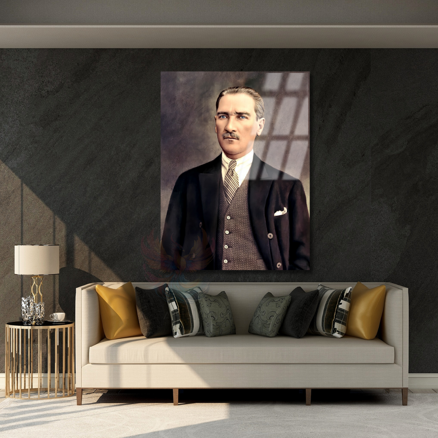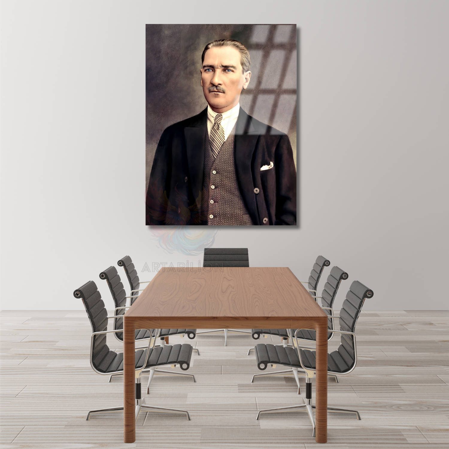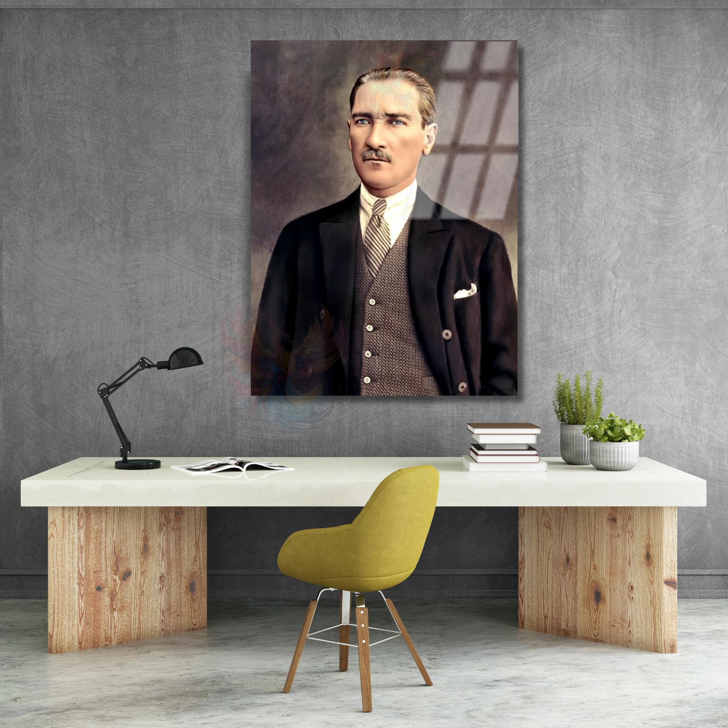 Renklendirilmiş Atatürk Cam Tablo Modeli Dikey Duvar Tablosu Ofis Ev Dekoru