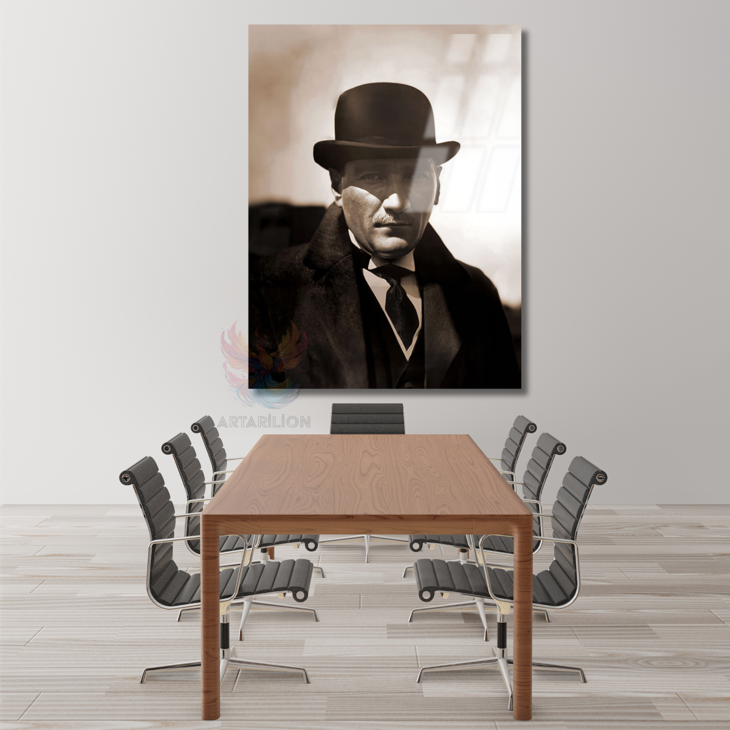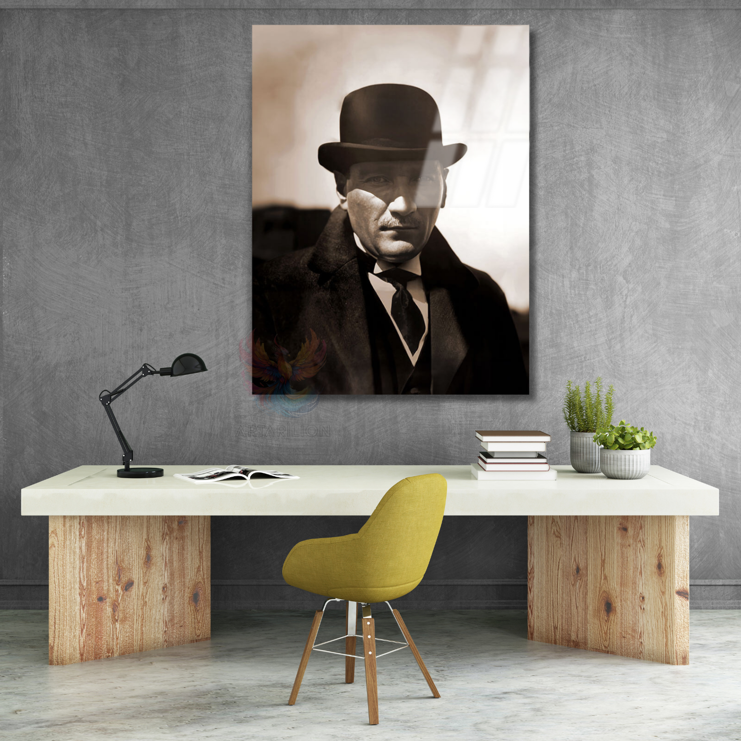 Şapkalı Atatürk Görseli Cam Tablo Dijital Baskı Ev Ofis Dekoru HD Dijital Baskı Tablo