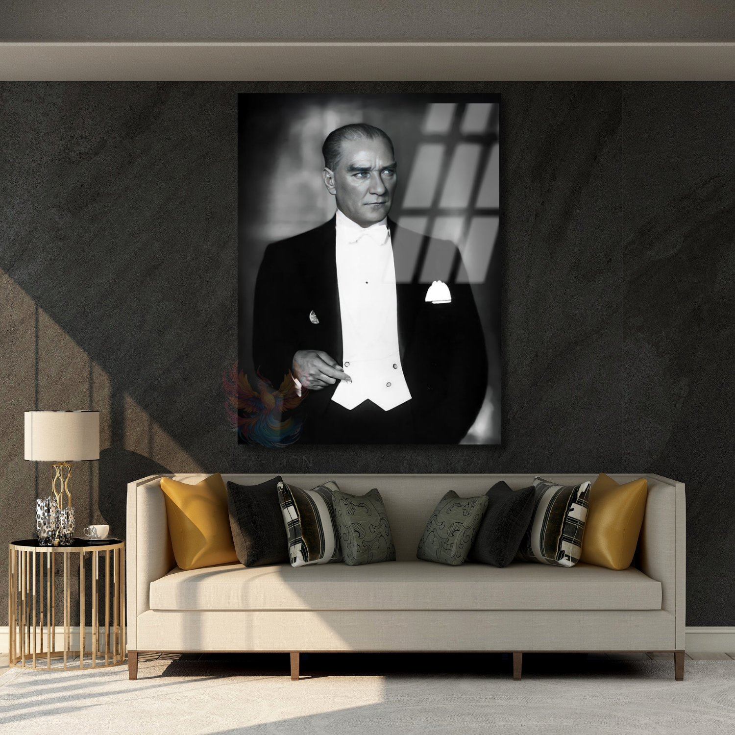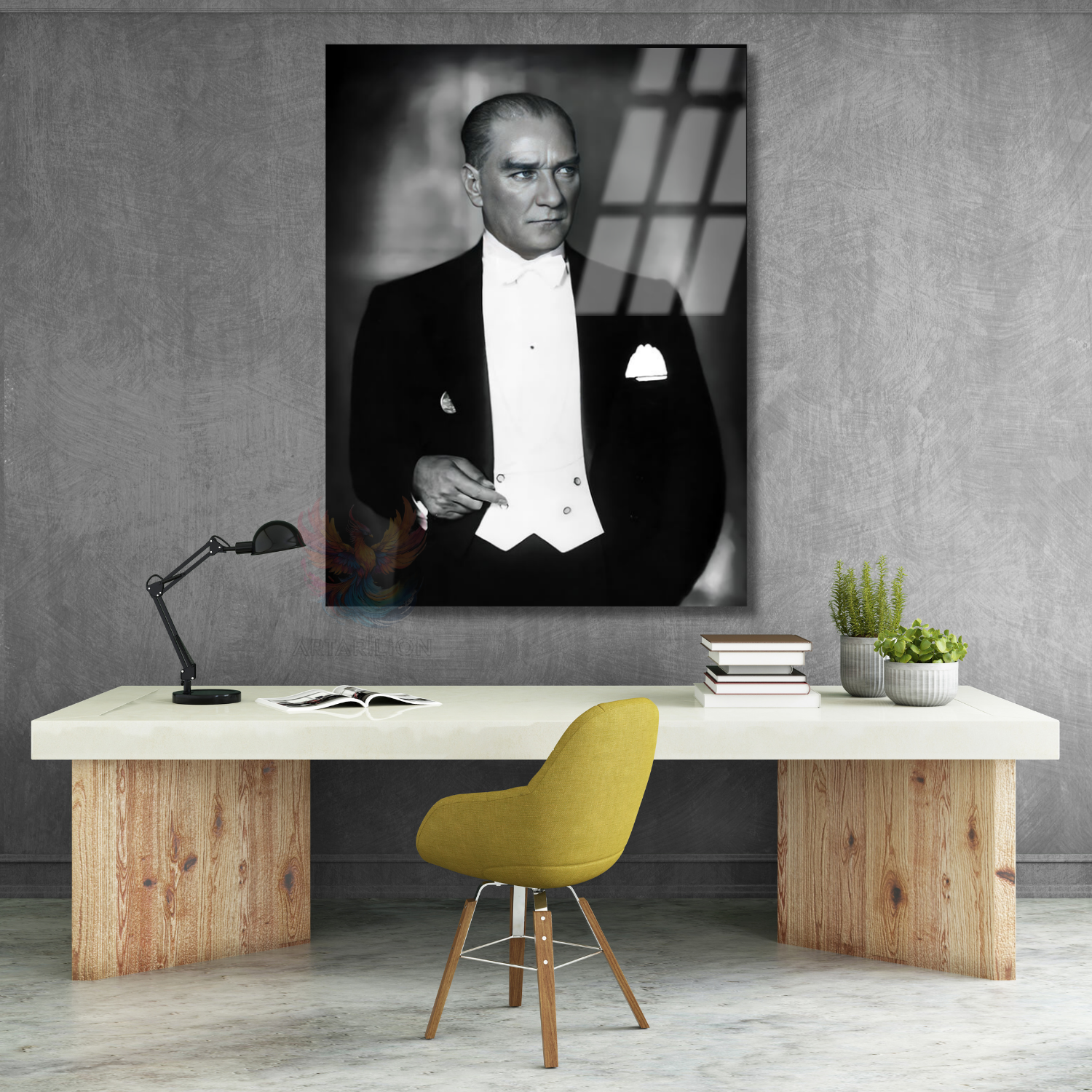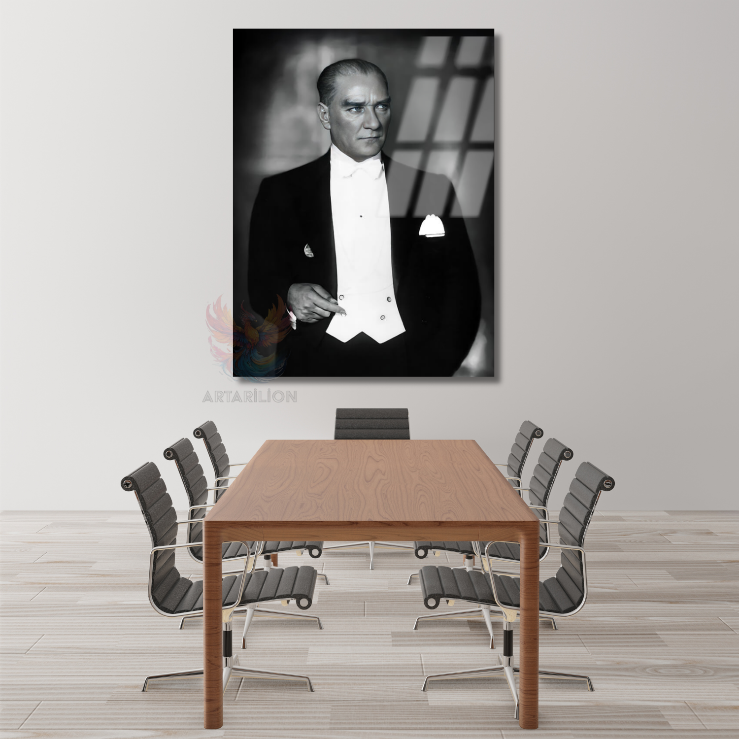 Mustafa Kemal Atatürk Siyah Beyaz Cam Tablo Dikey Duvar Tablosu Ev Ofis Tablosu
