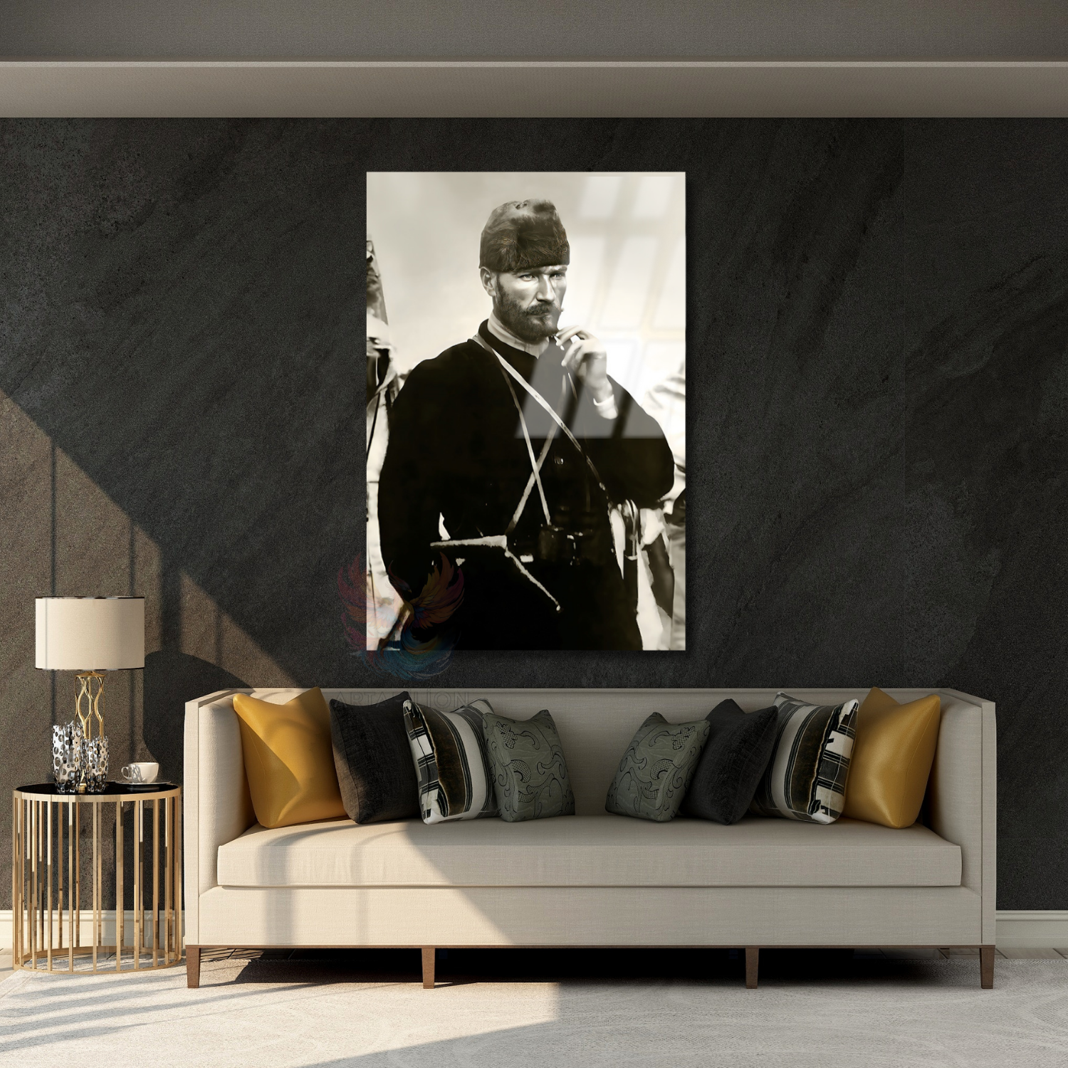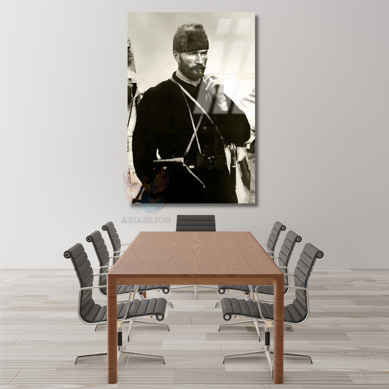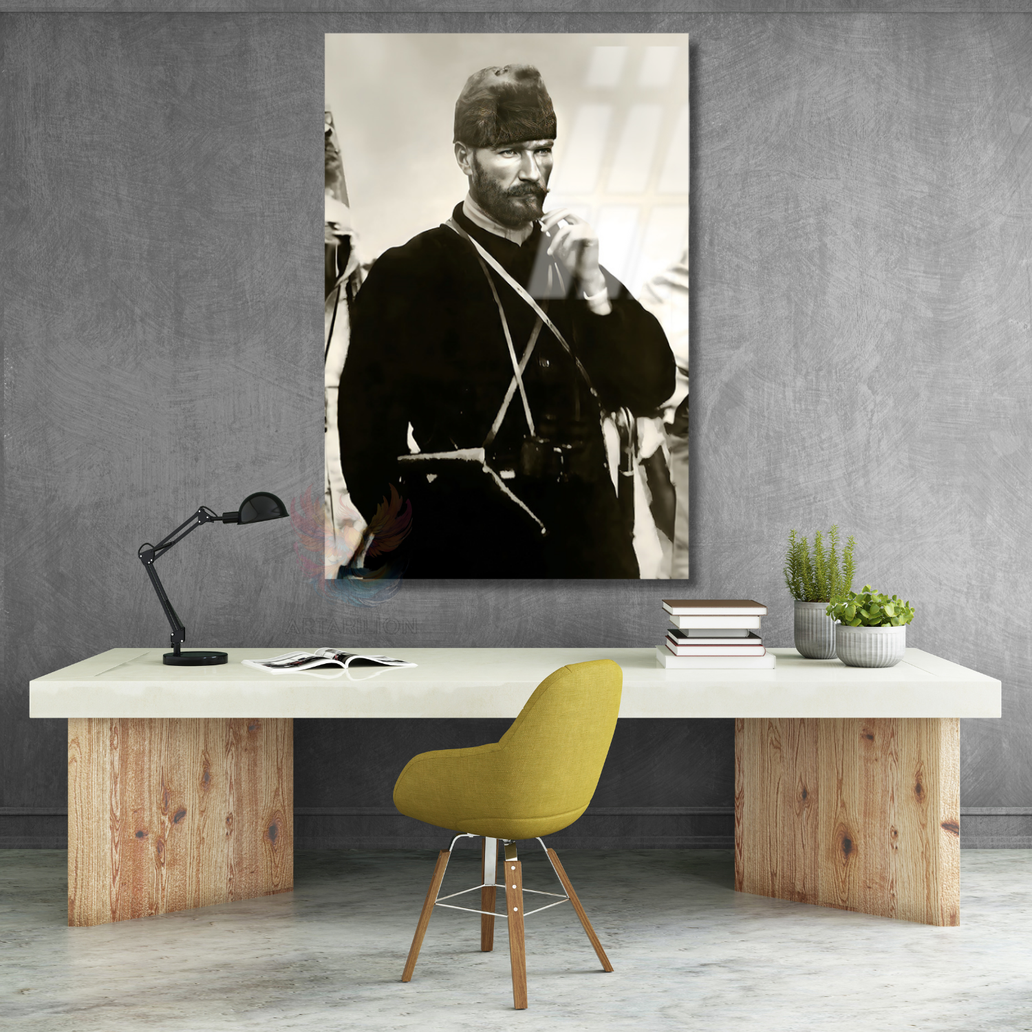 Genç Atatürk Siyah Beyaz Cam Tablo Dikey Duvar Dekoru Ev Ofis Tablo Modeli