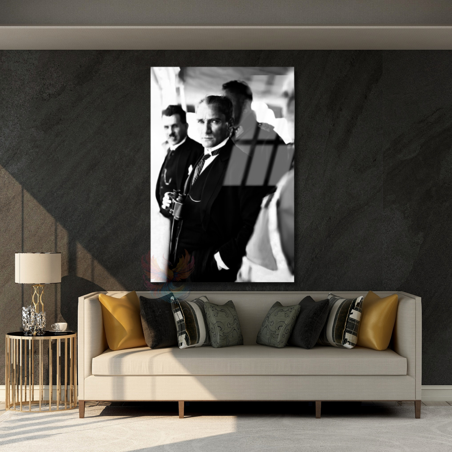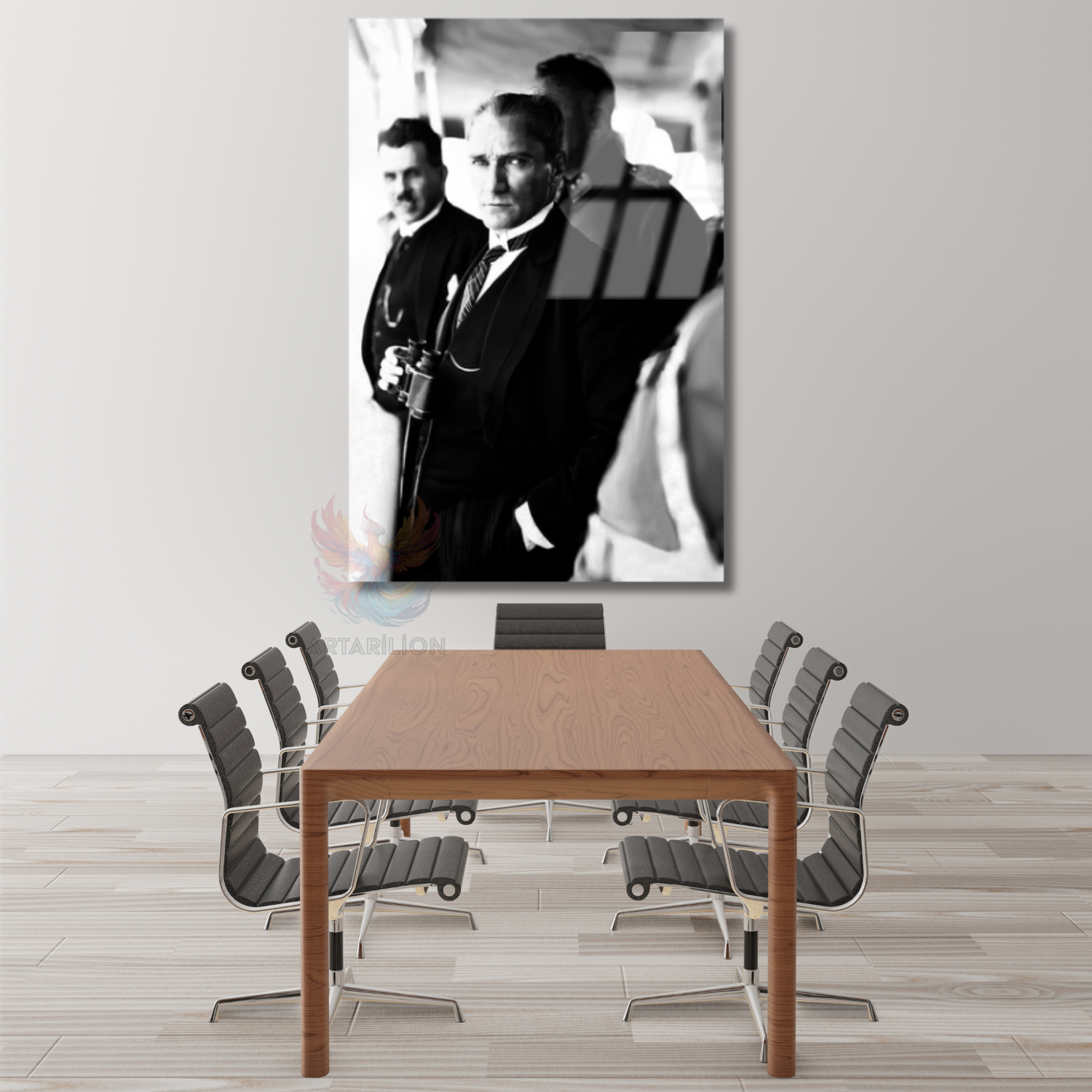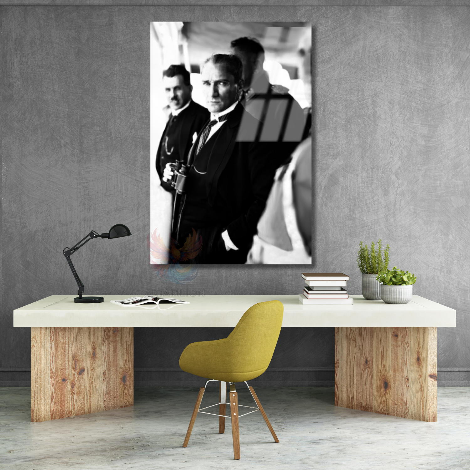Dürbün Tutan Atatürk Görseli Cam Tablo Siyah Beyaz Atatürk Görseli Dikey Tablo