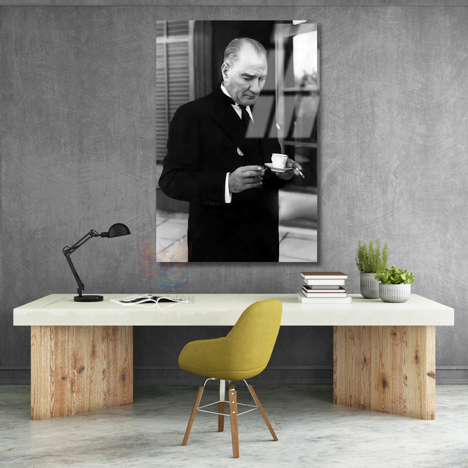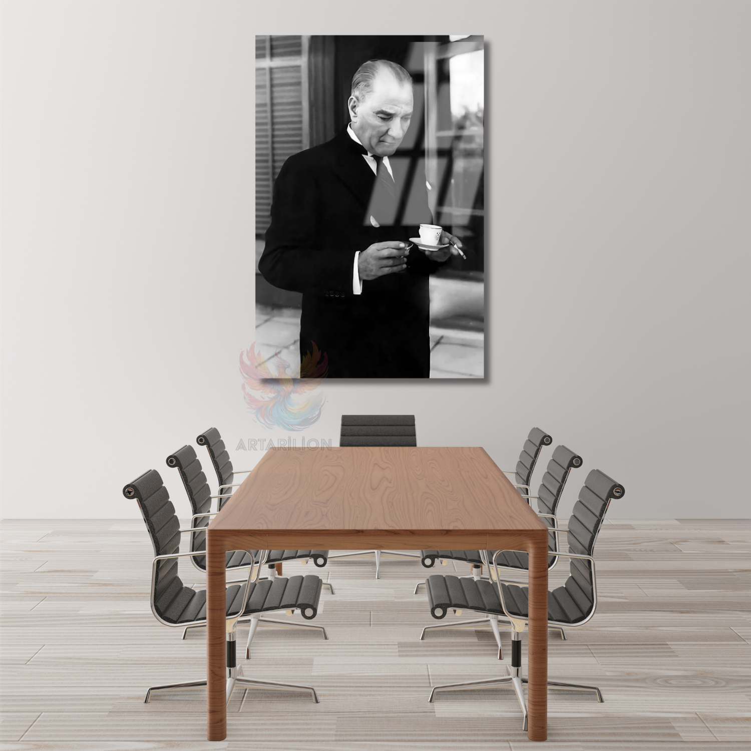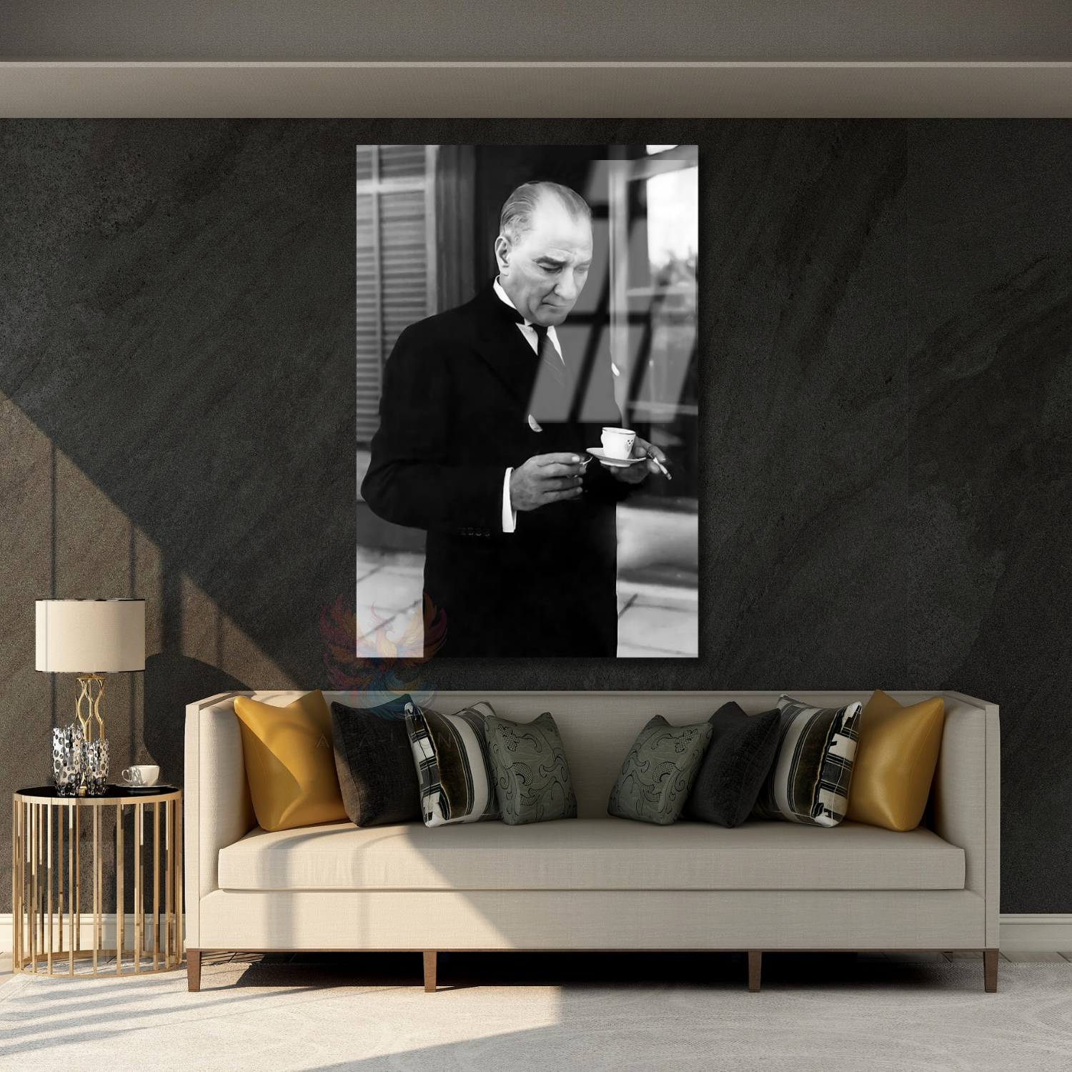 Dikey Cam Tablo Kahve İçen Atatürk Görseli Duvar Tablosu Ev Ofis Dekoru
