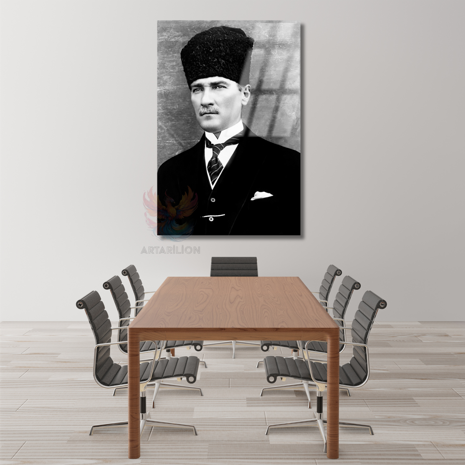 Dikey Cam Siyah Beyaz Atatürk Tablosu Cam Ofis Ev Tablosu Duvar Dekoru