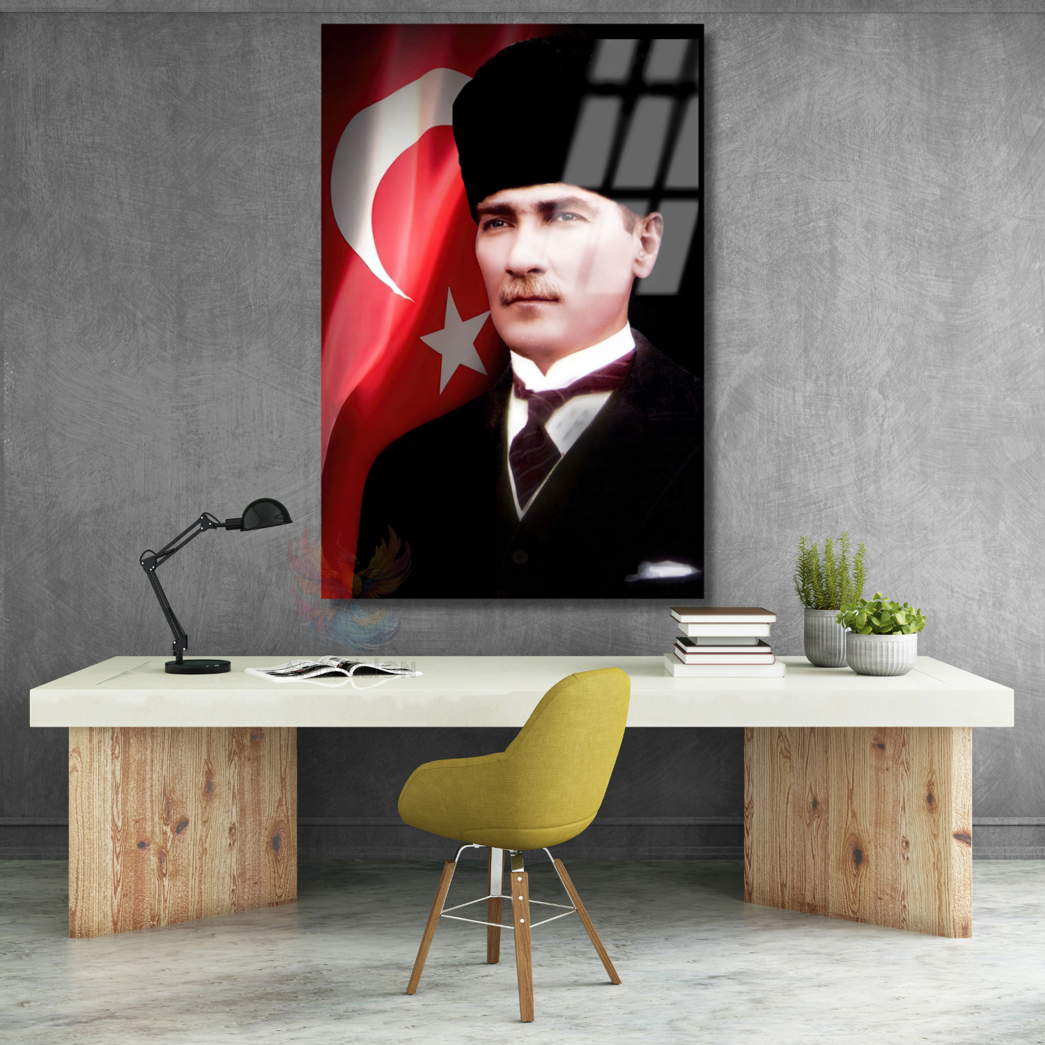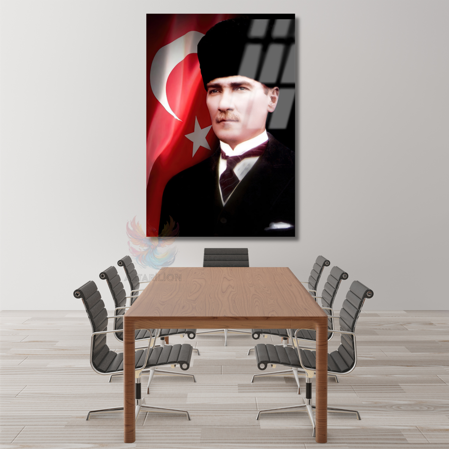 Atatürk ve Bayrak Cam Tablo Dikey Duvar Tablosu Ofis Ev Dekoru Atatürk Portresi