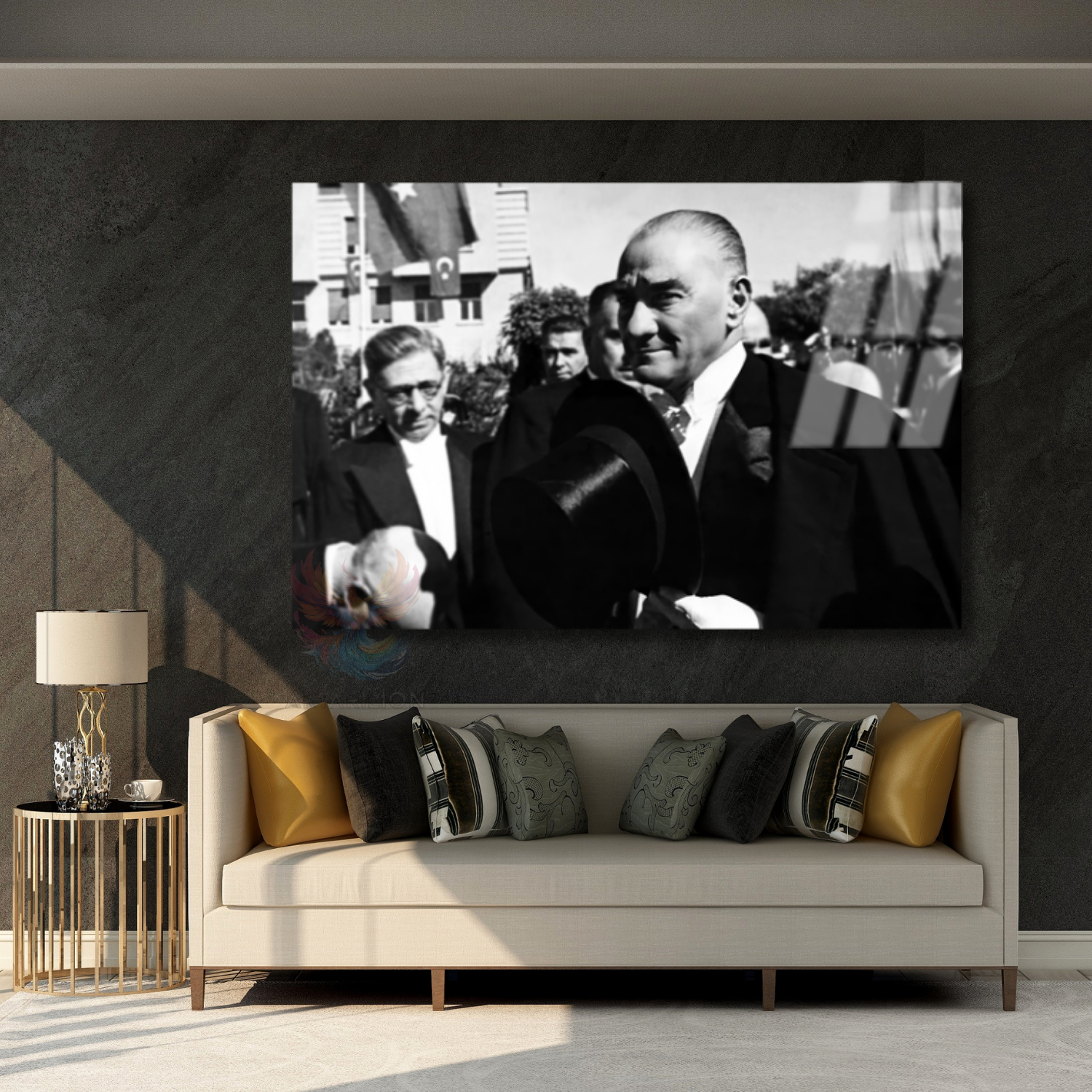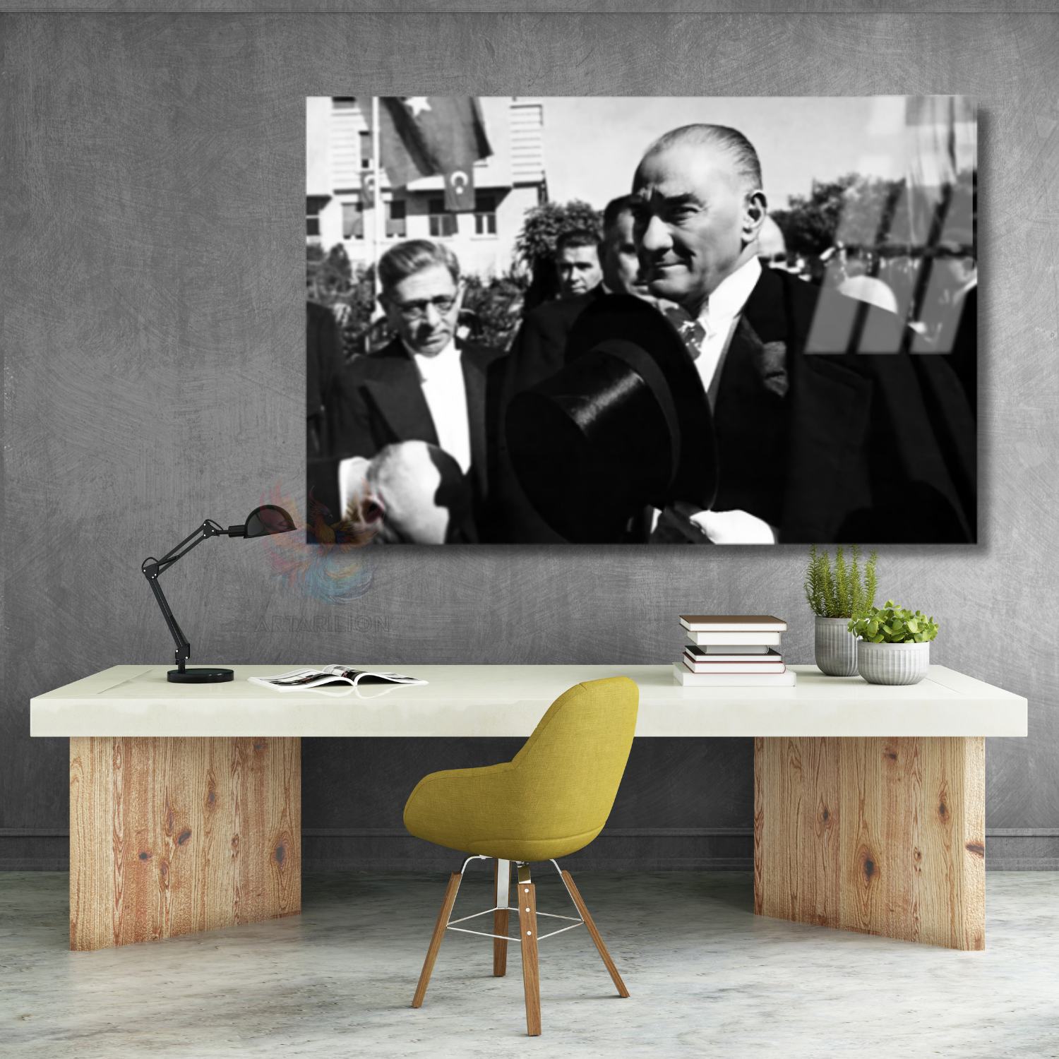 Siyah Beyaz Atatürk Cam Tablo Şapka Tutan Atatürk Tablosu Ofis Tablosu Duvar Dekoru