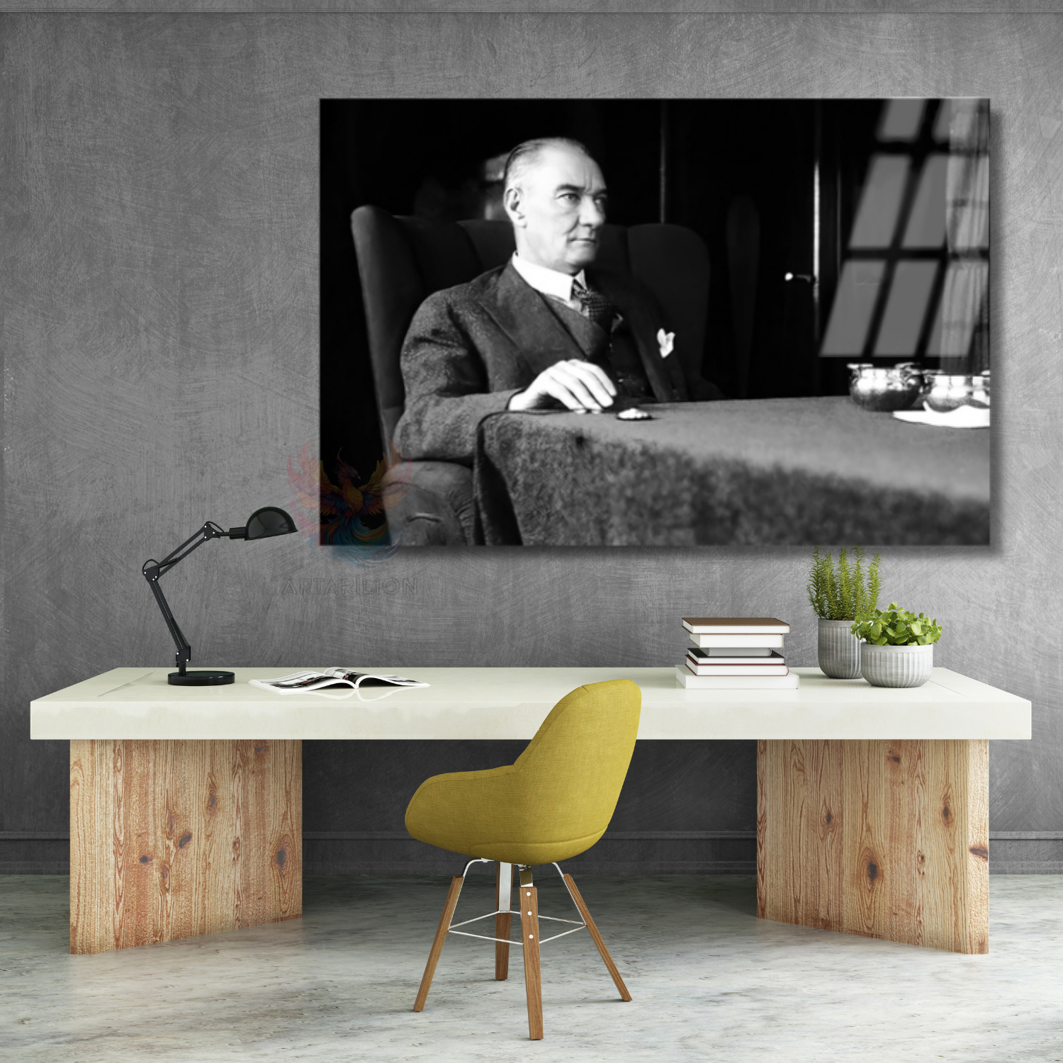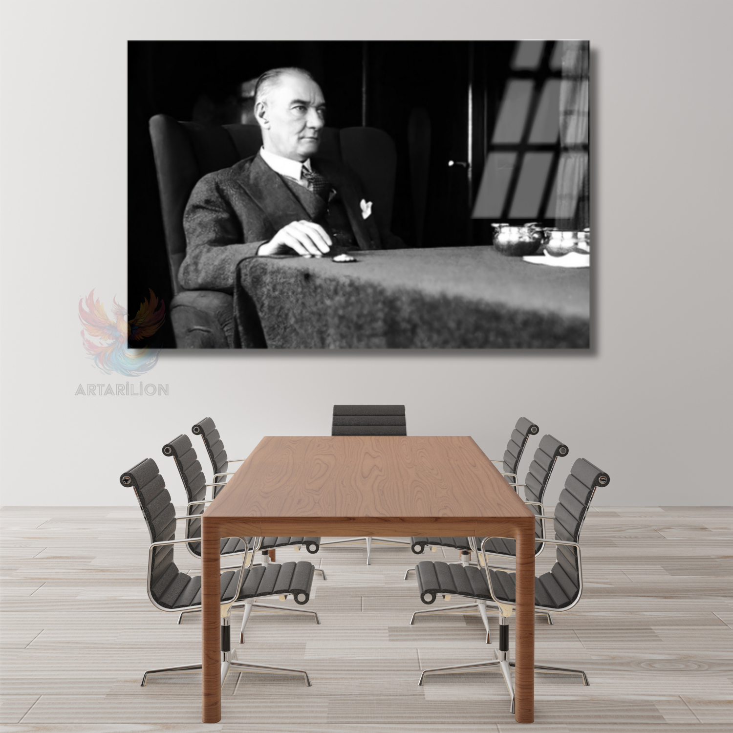 Siyah Beyaz Atatürk Tablosu Yatay Cam Tablo Modeli Ev Ofis Duvar Dekoru