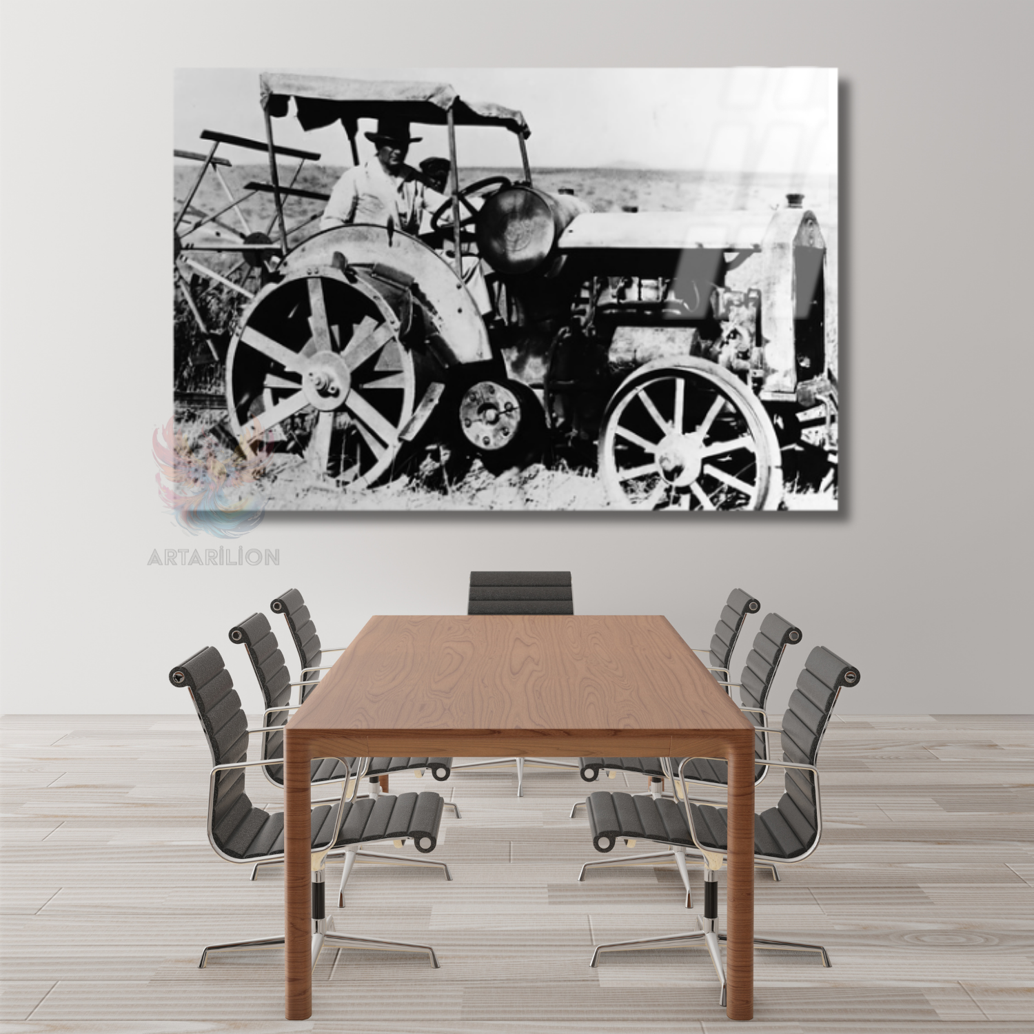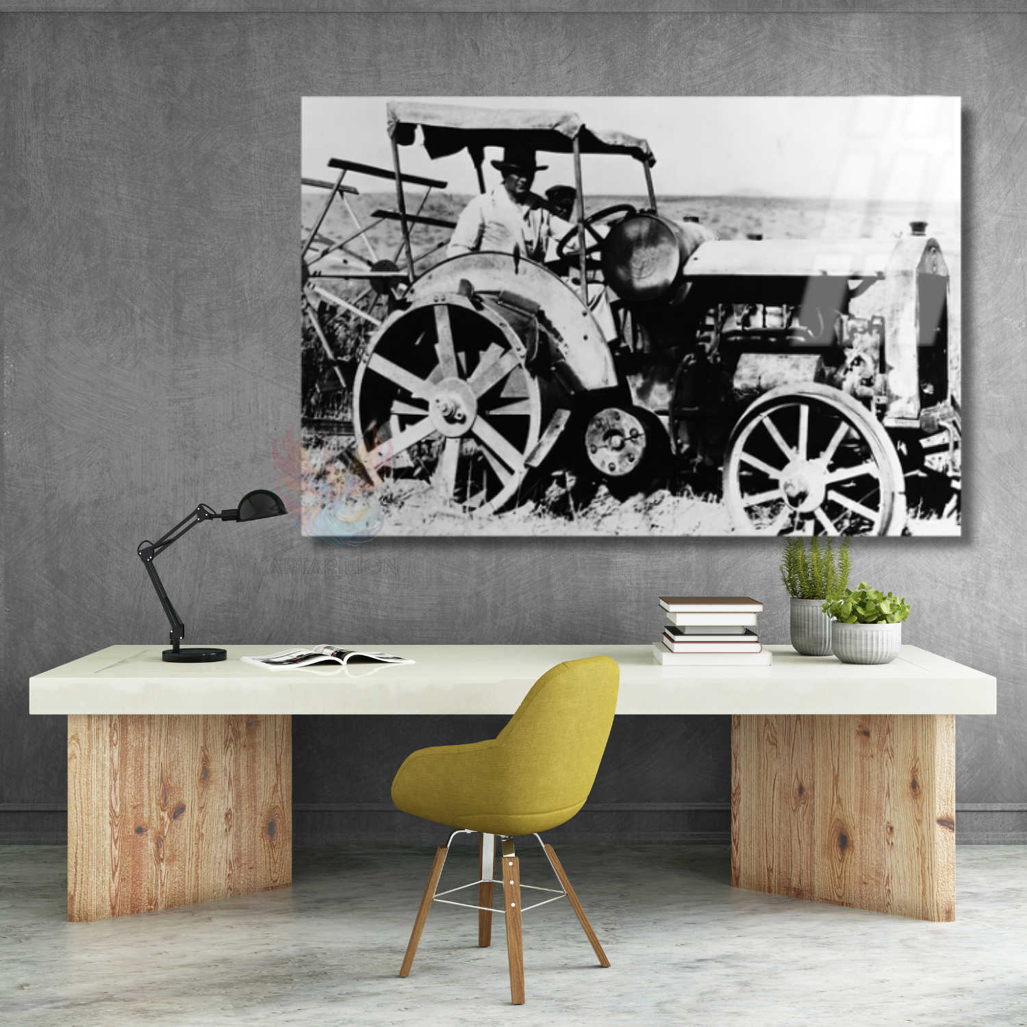 Traktör Süren Atatürk Tablosu Cam Tablo HD Dijital Baskı Yatay Duvar Tablosu