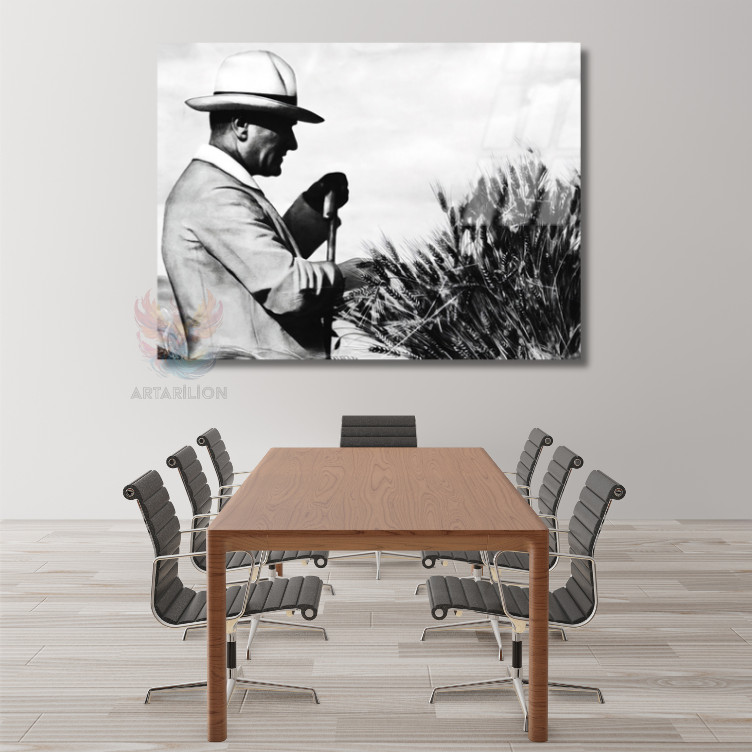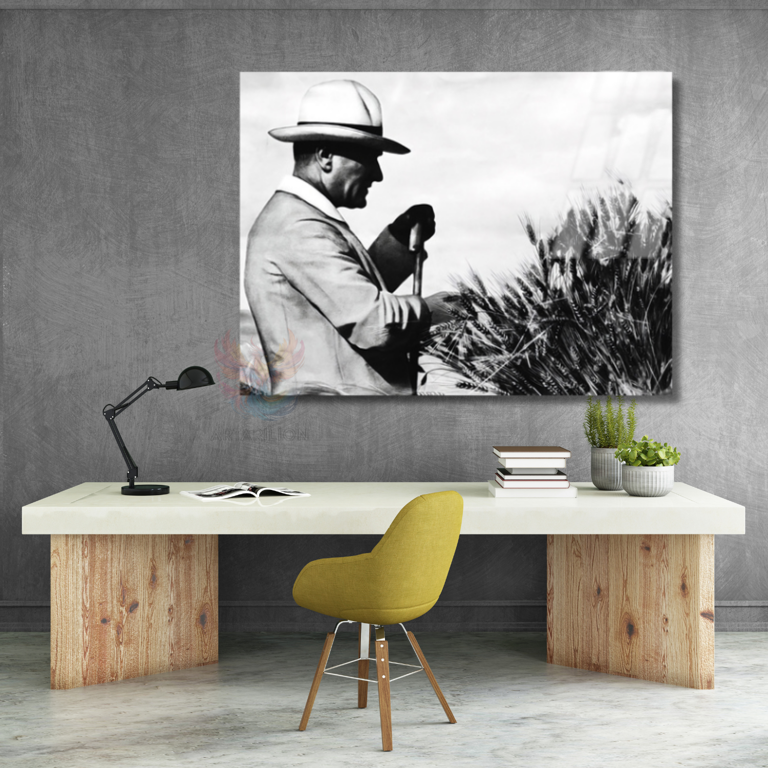 Atatürk Cam Tablo Atatürk Tarlada Görseli Duvar Tablosu Yatay Tablo Ev Ofis Dekoru