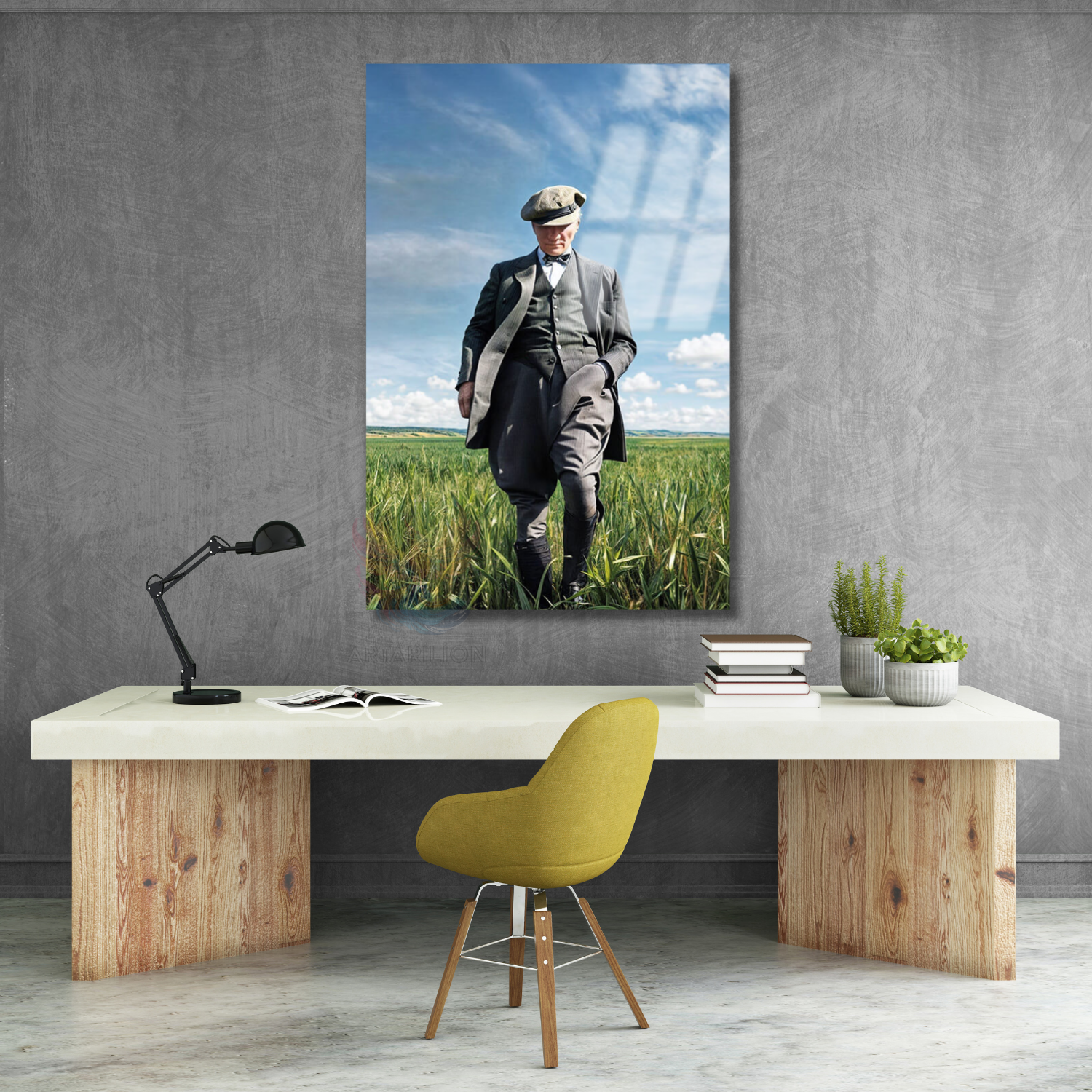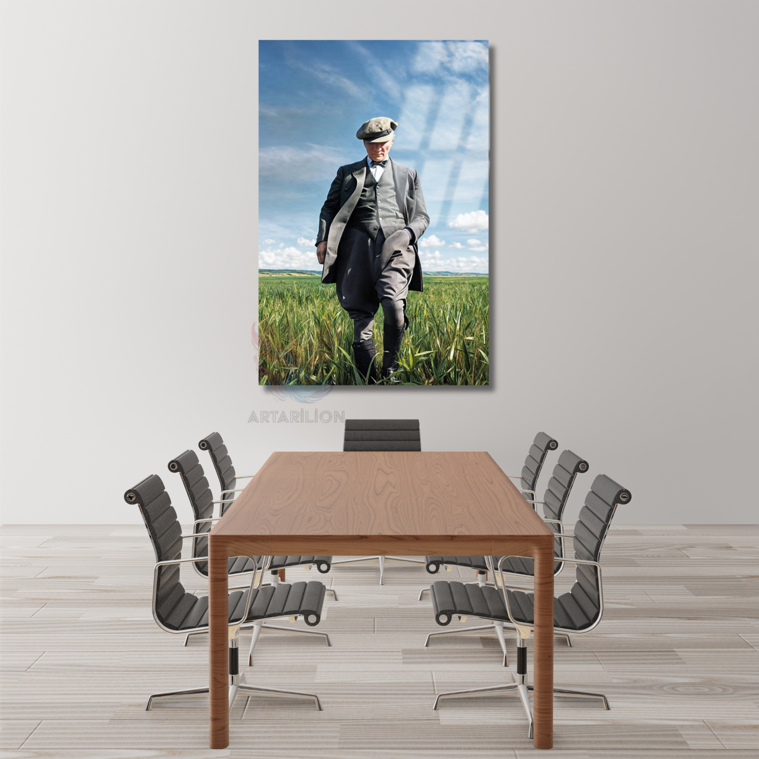 Tarlada Yürüyen Atatürk Görseli Cam Tablo Dikey Tablo Renkli Atatürk Tablosu
