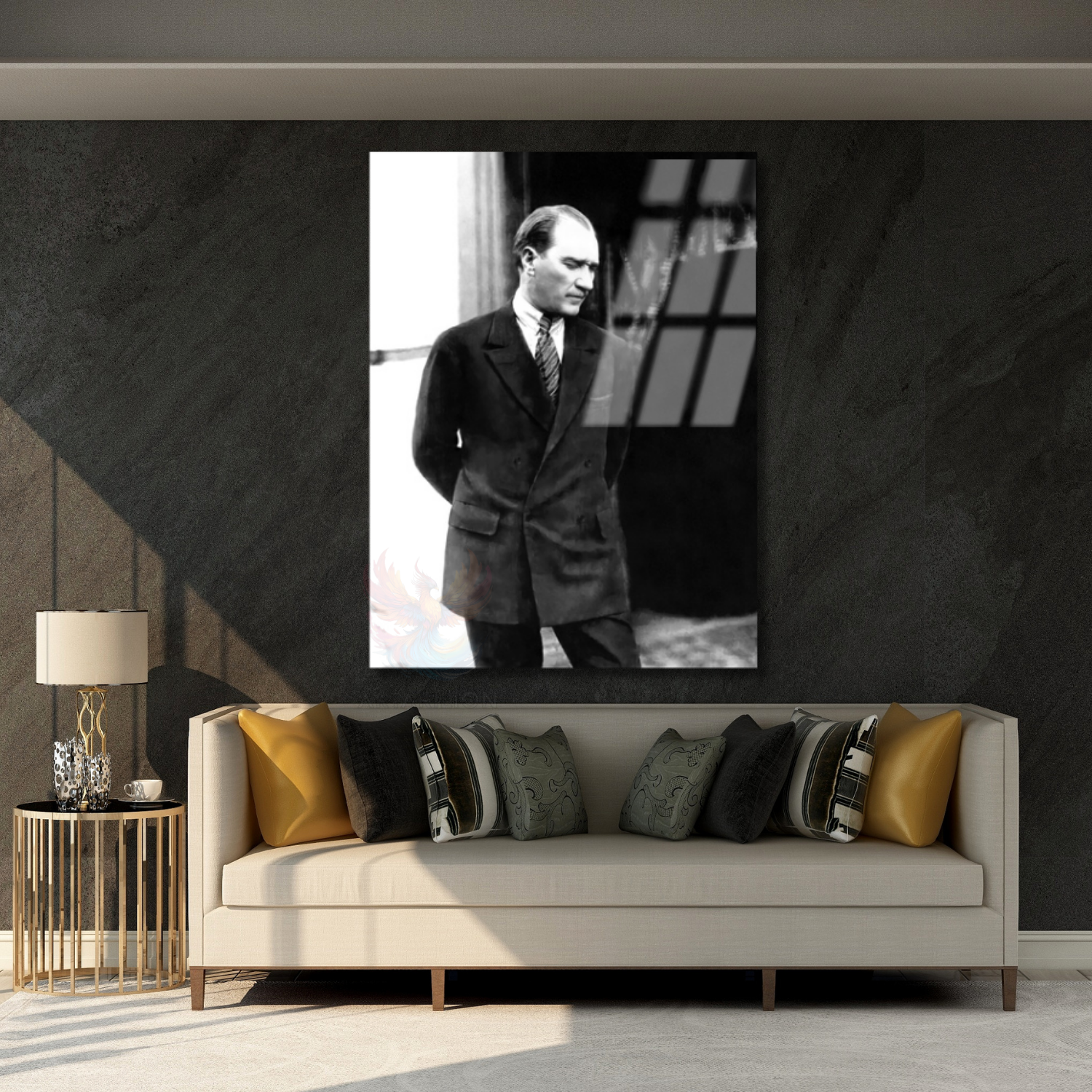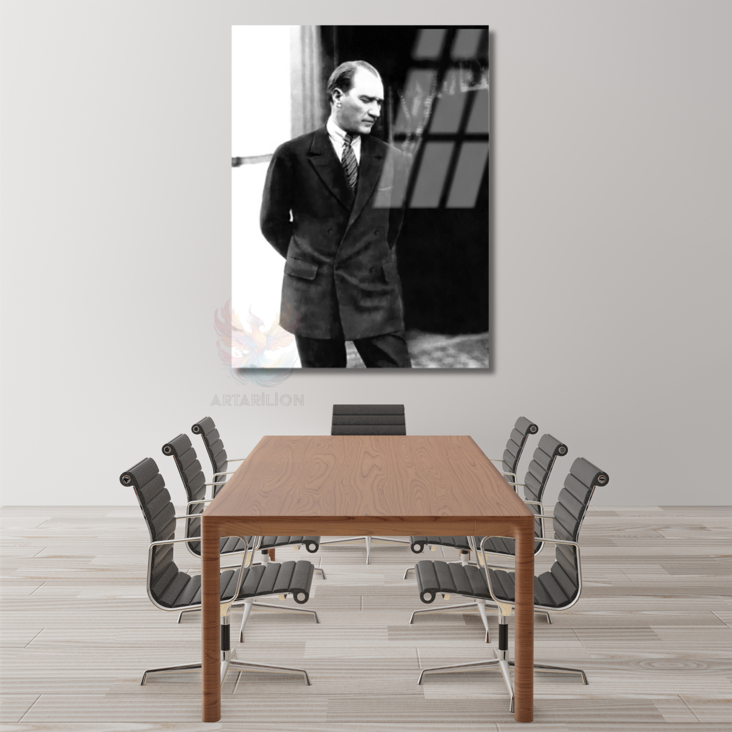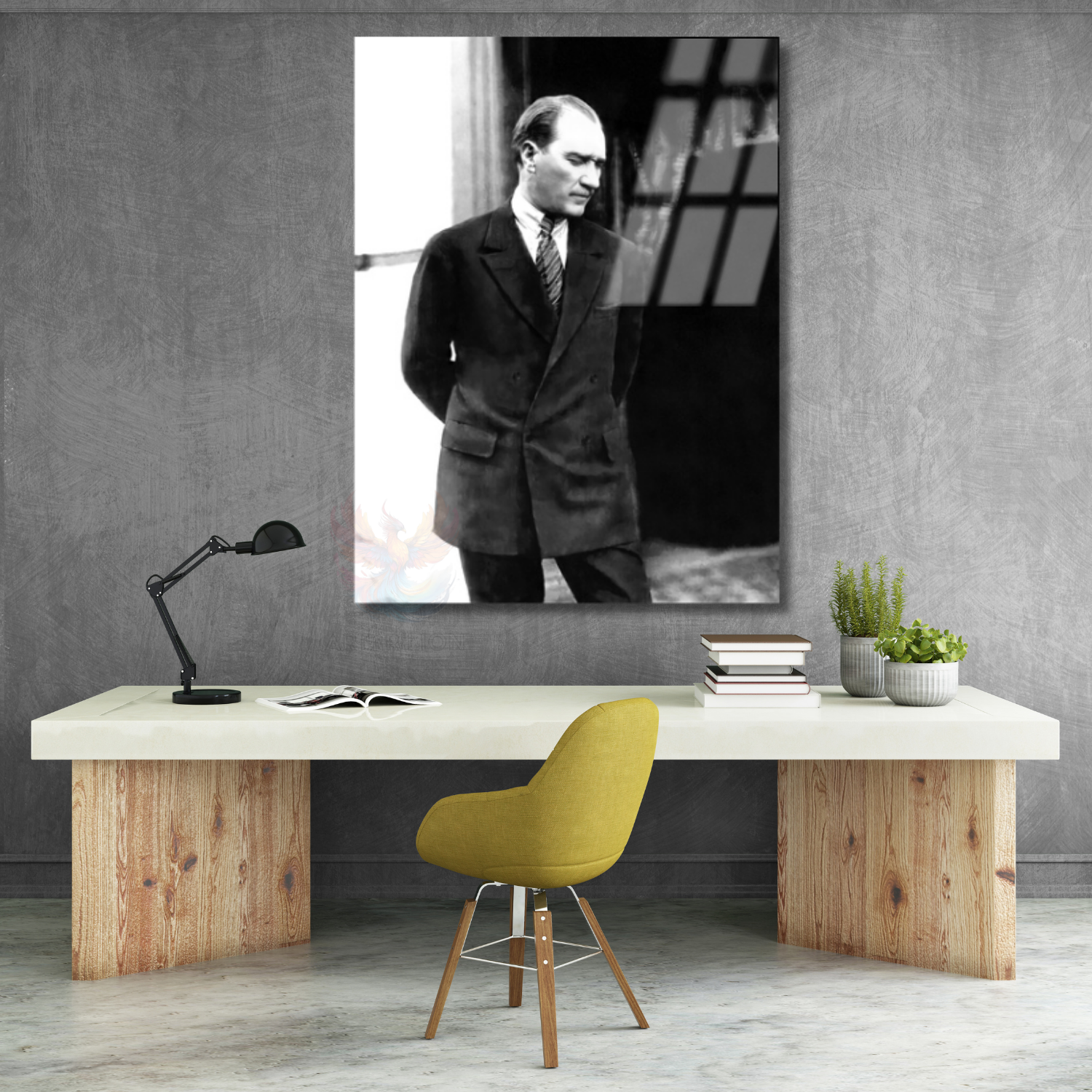 Kemal Atatürk Cam Tablo Siyah Beyaz Atatürk Tablosu Dikey Duvar Tablo Ev Ofis Dekoru