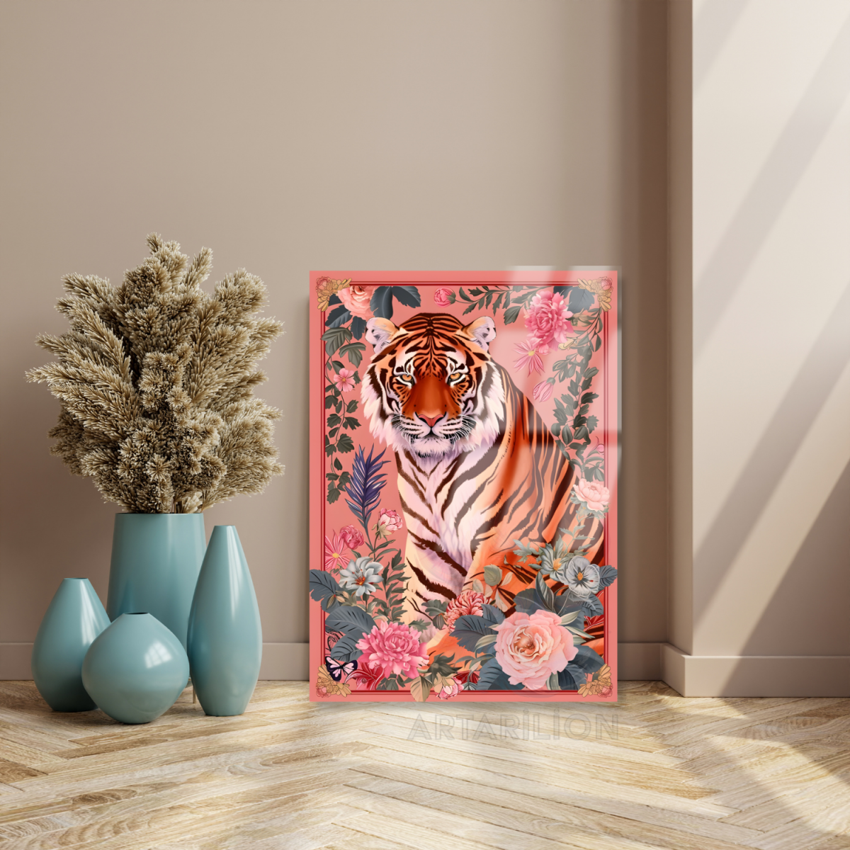 Kırılmaz Cam Tablo Çiçeklerin İçindeki Kaplan Dijital Baskı Salon Tablosu