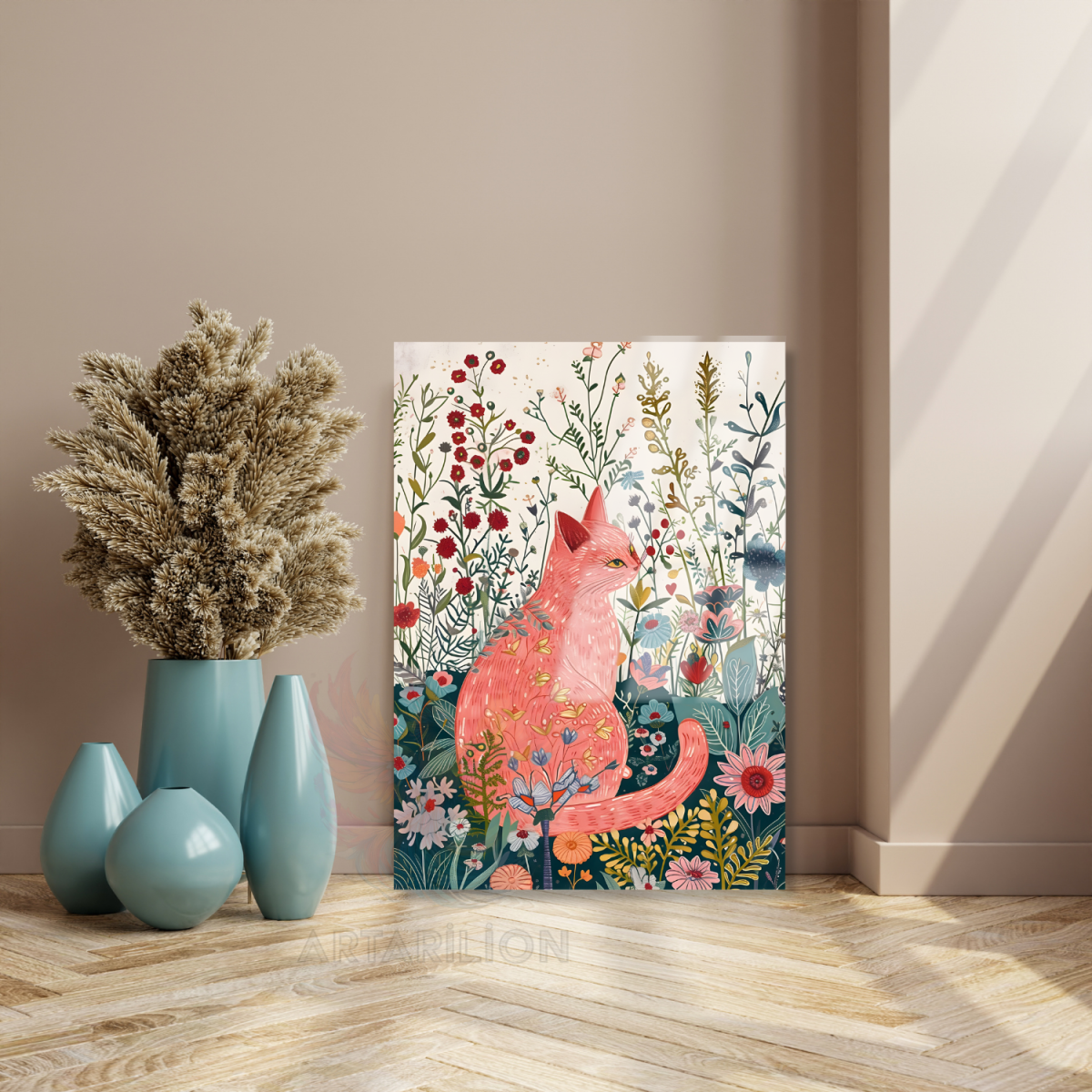 Kırılmaz Cam Tablo Çiçeklerin İçindeki Pembe Kedi Dijital Baskı Salon Tablosu