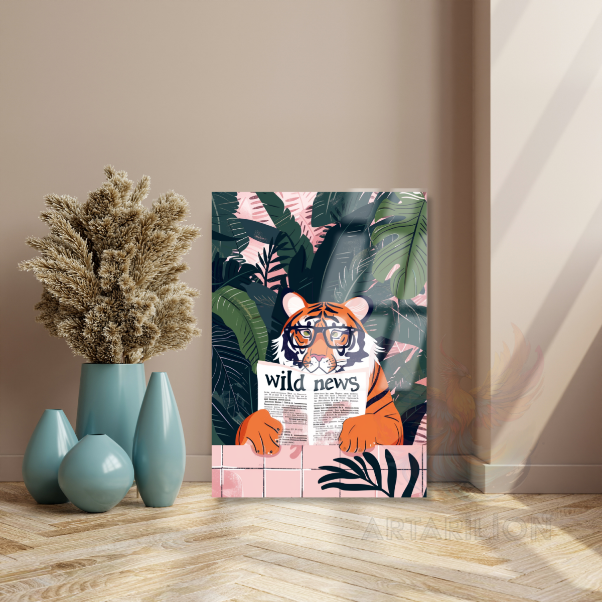 Kırılmaz Cam Tablo Gazete Okuyan Gözlüklü Kaplan Kırılmaz Cam Tablo Yeni Ev Hediyesi