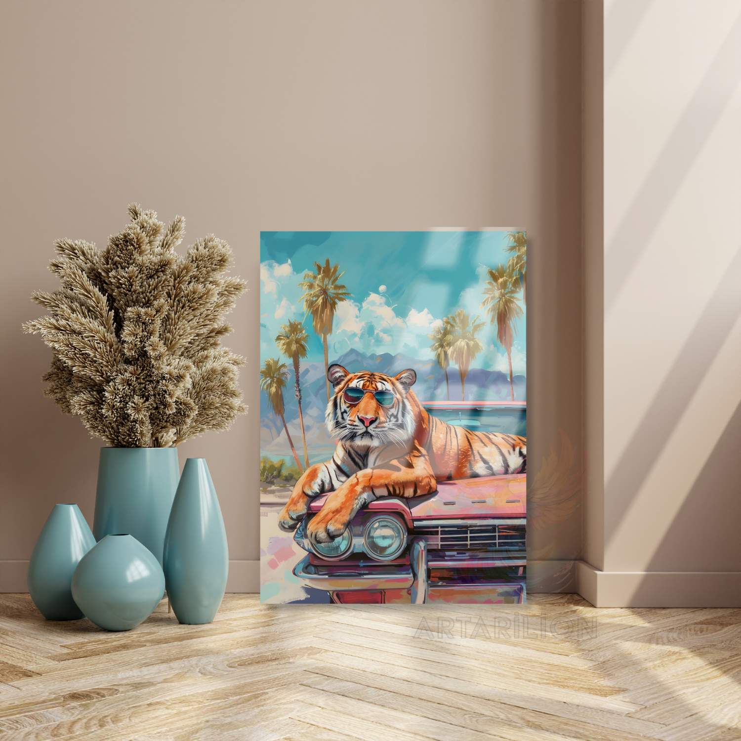 Kırılmaz Cam Kaplan Tablosu Arabanın Üzerine Yatan Gözlüklü Tarz Aslan Kırılmaz Cam Tablo
