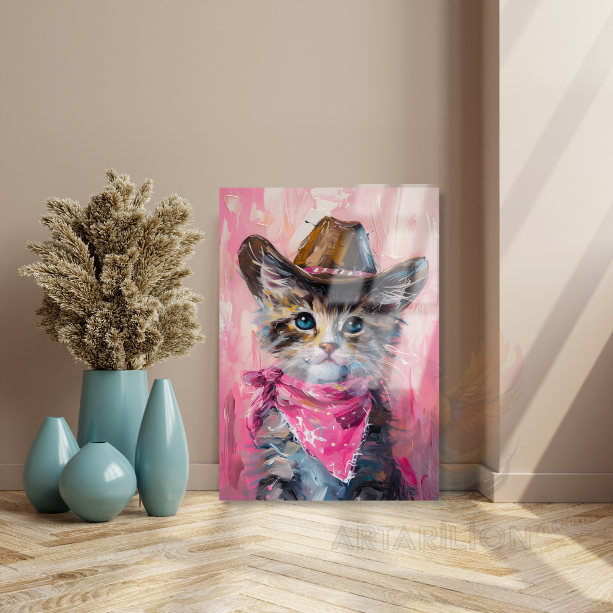 Kovboy Şapkalı Kedi Kırılmaz Cam Tablo HD Dijital Baskı Kırılmaz Cam Kedi Tablosu Salon Tablosu