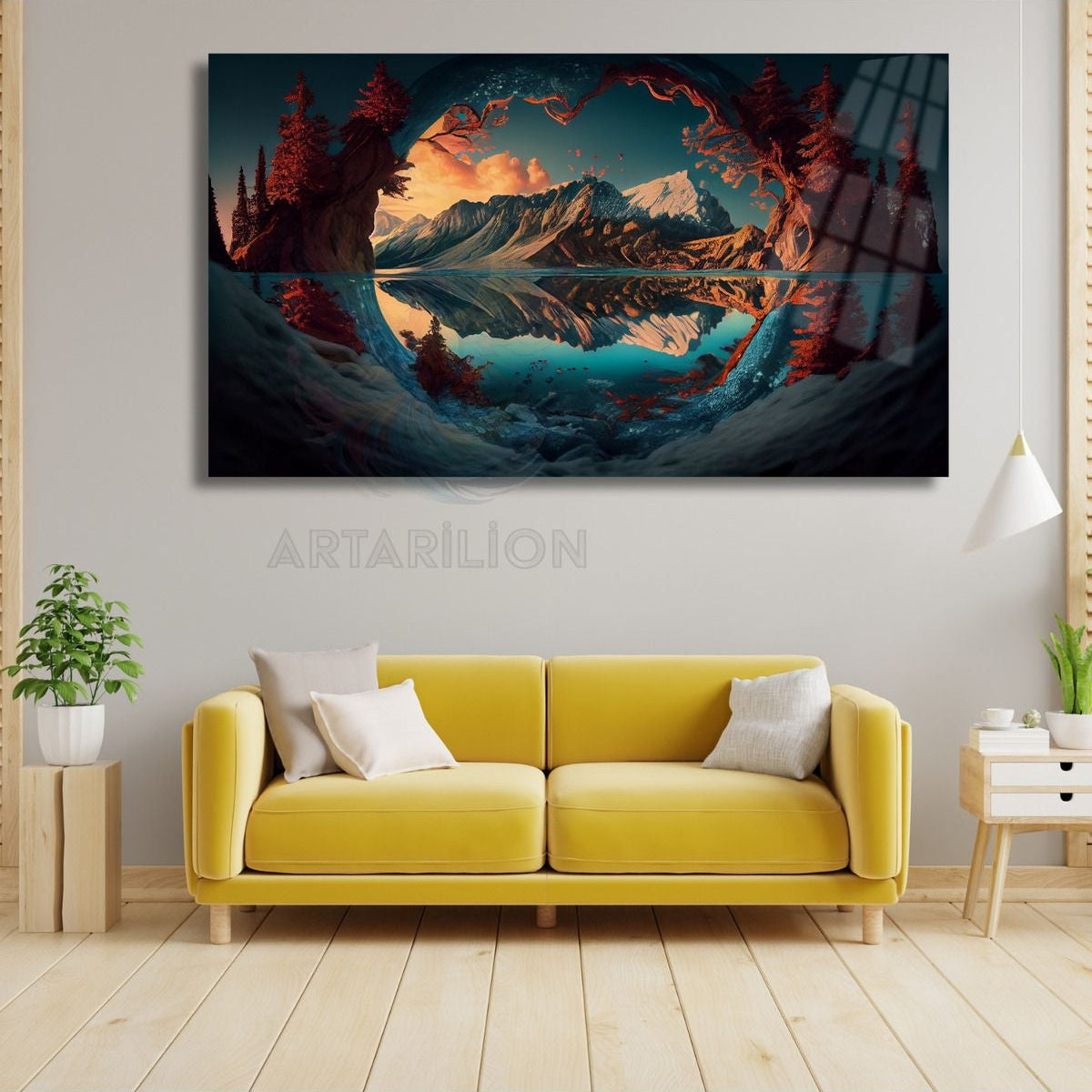 Dağ ve Göl Manzarası Kırılmaz Cam Dijital Baskı Tablo Duvar Dekoru Şık Tasarım Tablo Modeli