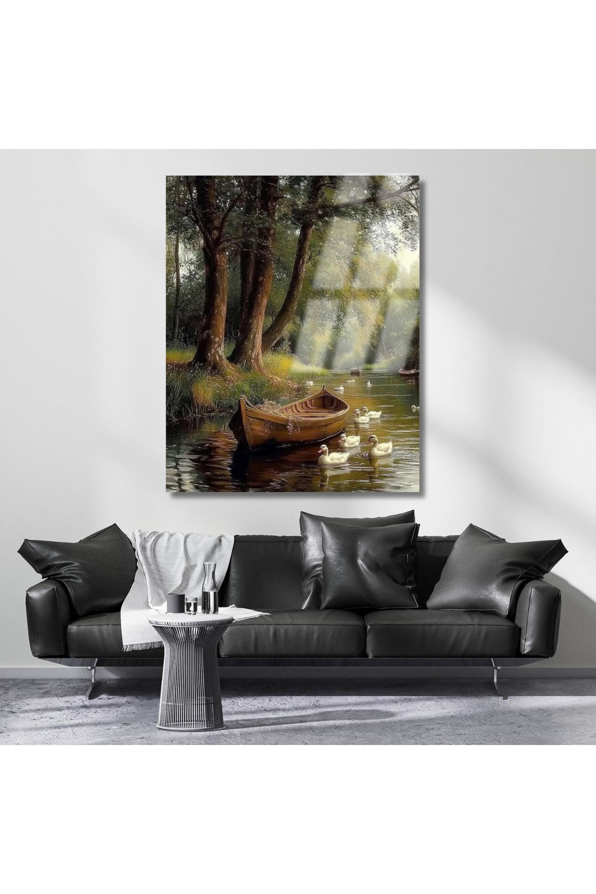 Göldeki Kayık ve Ördekler Manzara Kırılmaz Cam Tablo Ev Dekoru Salon Tablosu