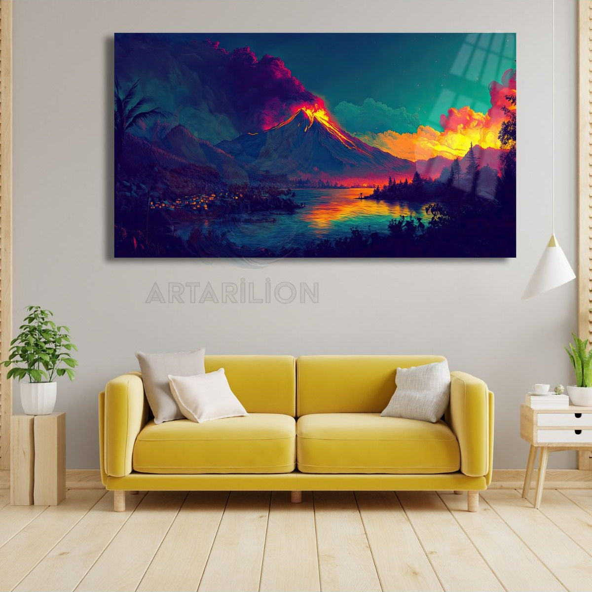 Dijital Baskı Kırılmaz Cam Tablo Patlayan Yanardağ Manzara Tablosu Oyun Odası Tablosu