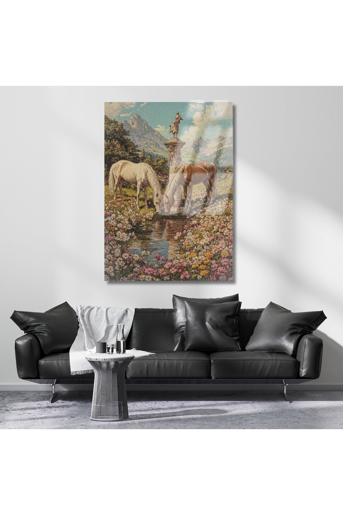 Klasik Görünümlü Su İçen Atlar Kırılmaz Cam Tablo Ev Dekoru Salon Tablosu