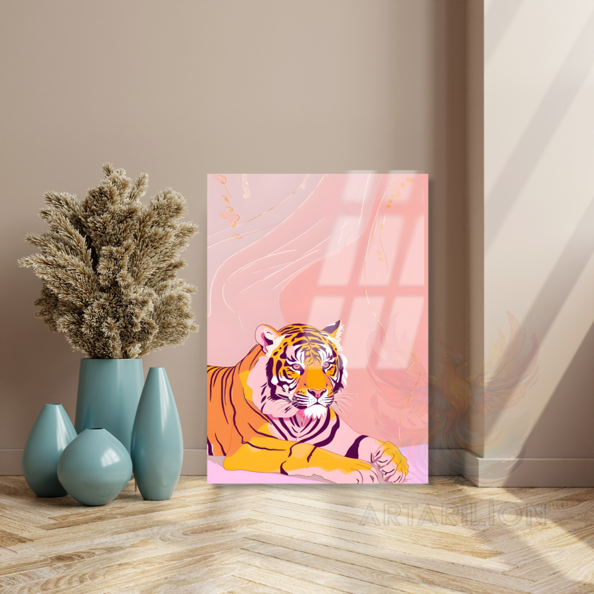 Kırılmaz Cam Tablo Kaplan Görseli Pembe Arkaplan Modern Duvar Tablosu