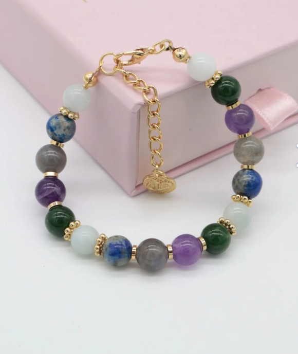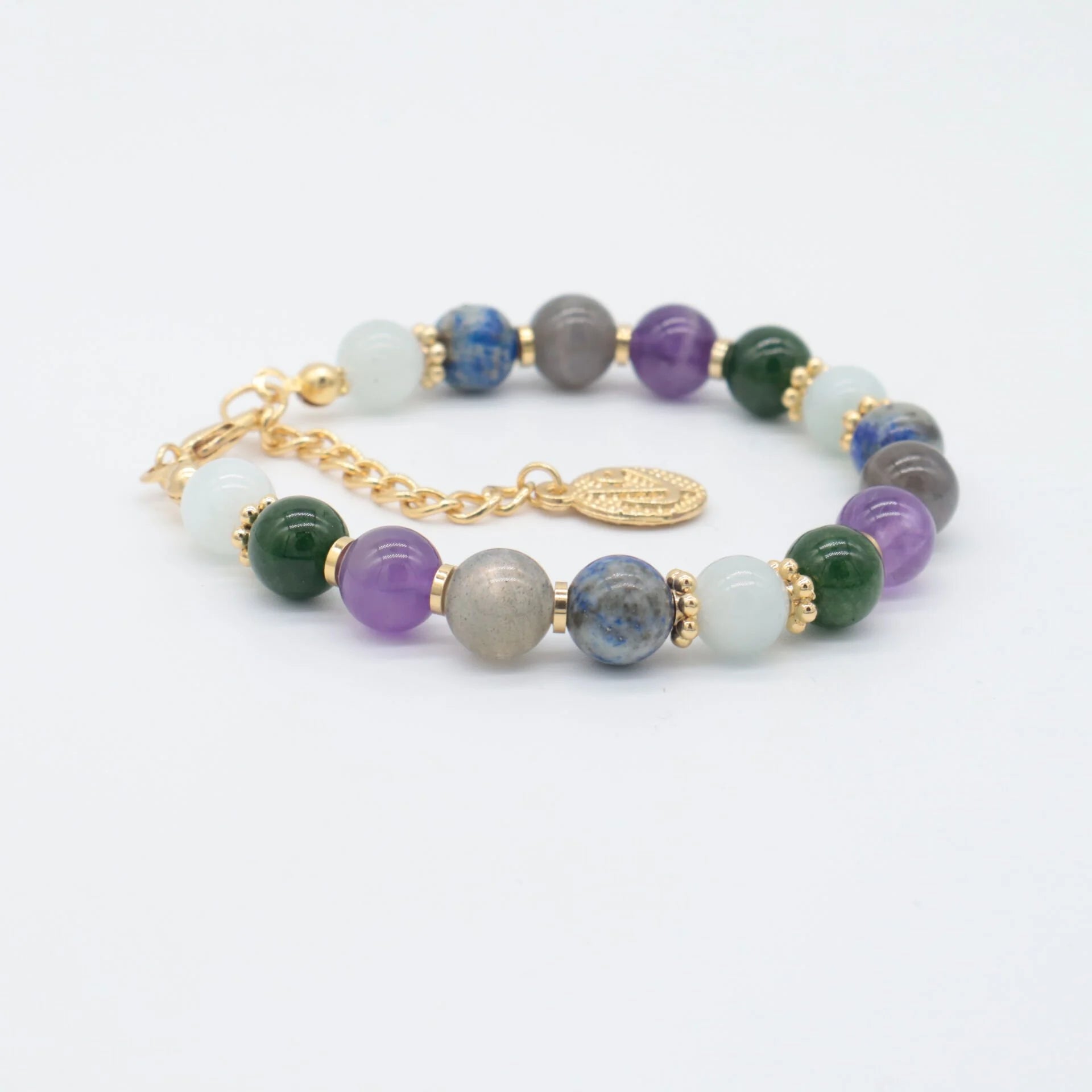 Gelin, sizi bir iç huzur yolculuğuna davet edelim! İlahi Aşk Bilekliği, Lapis, Ametist, Akuamarin, Labradorit ve Yeşim gibi güçlü doğal taşların enerjisini bir araya getirerek, size derin bir spiritüel deneyim sunuyor. Bu eşsiz bileklik, size içsel denge, sevgi ve manevi yolculuğunuzda rehberlik etmek için tasarlandı.