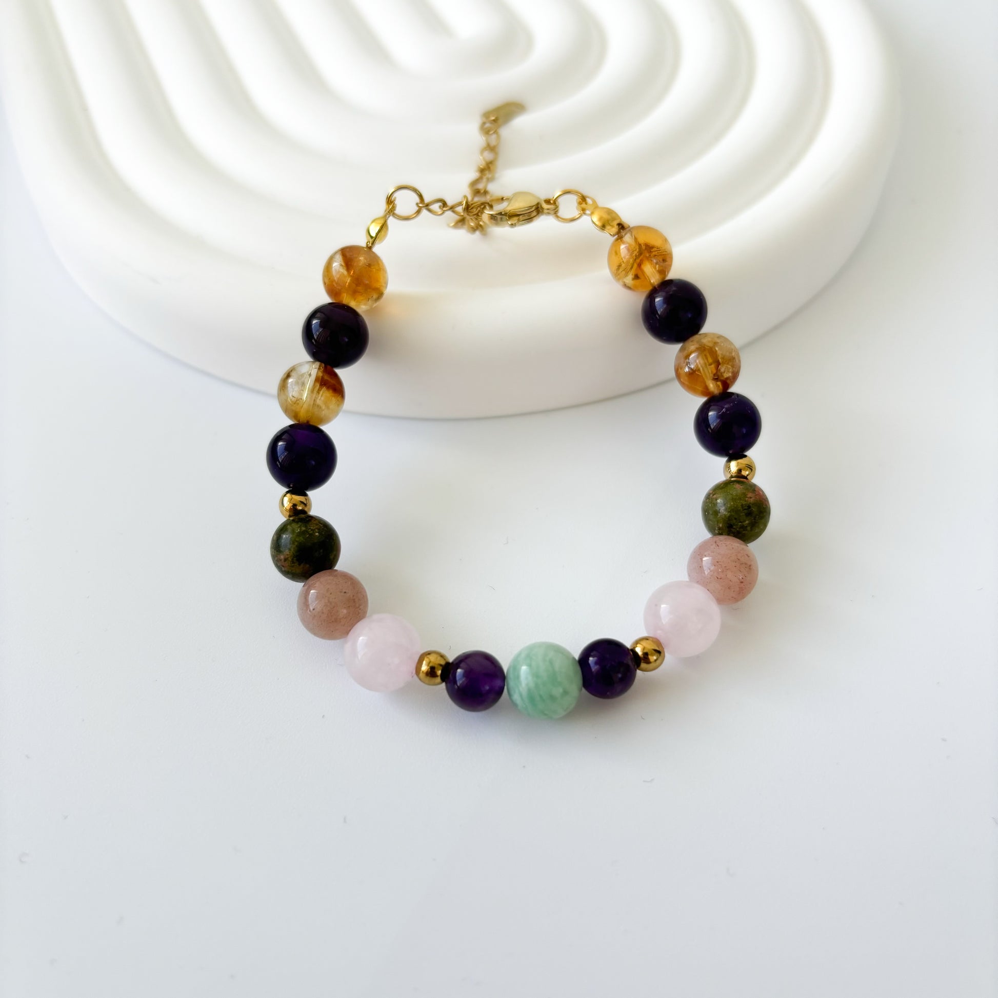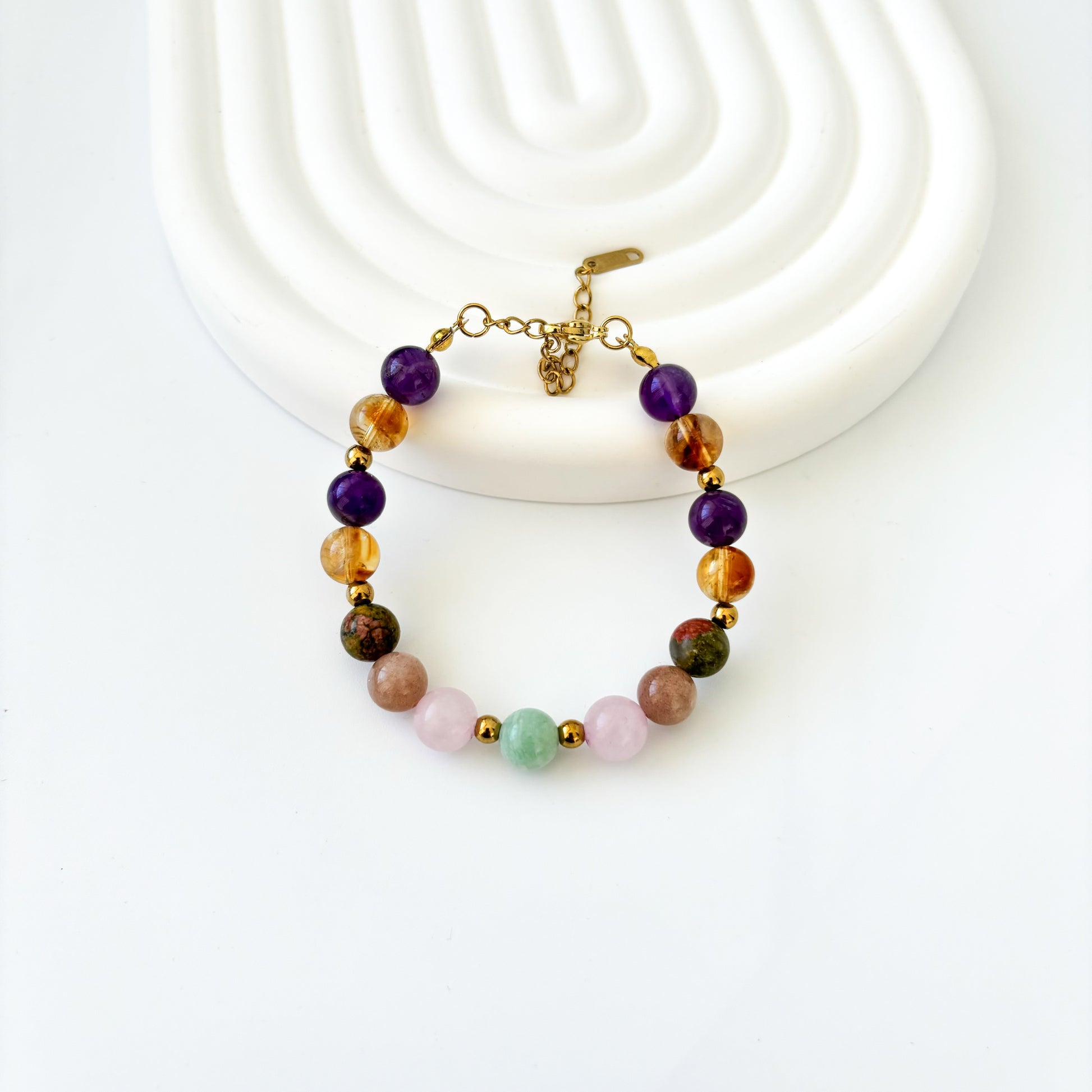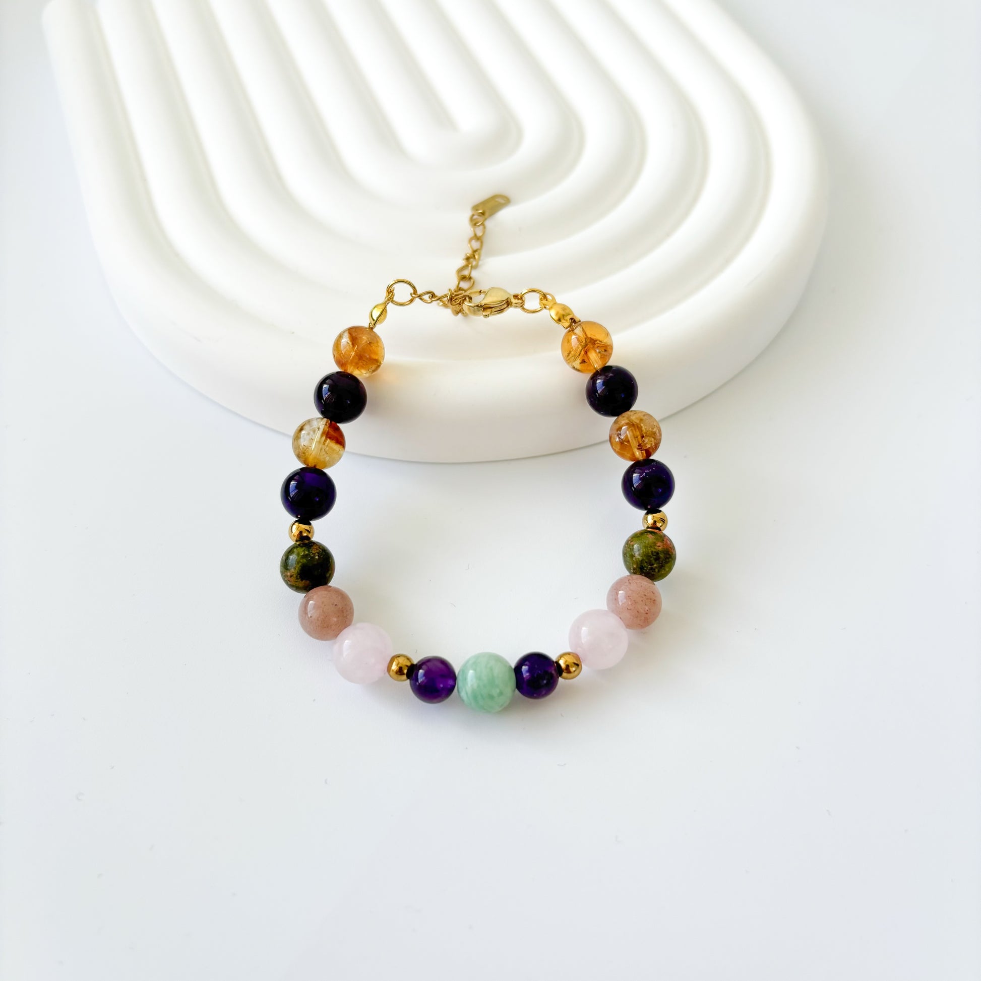 Doğal taşların büyüleyici enerjisiyle tasarlanan dişil enerji bilekliğimizle tanışın! Pembe Kuvars, Sitrin, Ametist, Unakit, Güneş Taşı ve Amazonit'in birleşimi, içsel gücünüzü ve zarafetinizi ortaya çıkaracak. Bu özel bileklik, dişil enerjiyi desteklerken, aynı zamanda denge ve huzur getirir. İşte bu bileklikte kullanılan taşların faydaları: