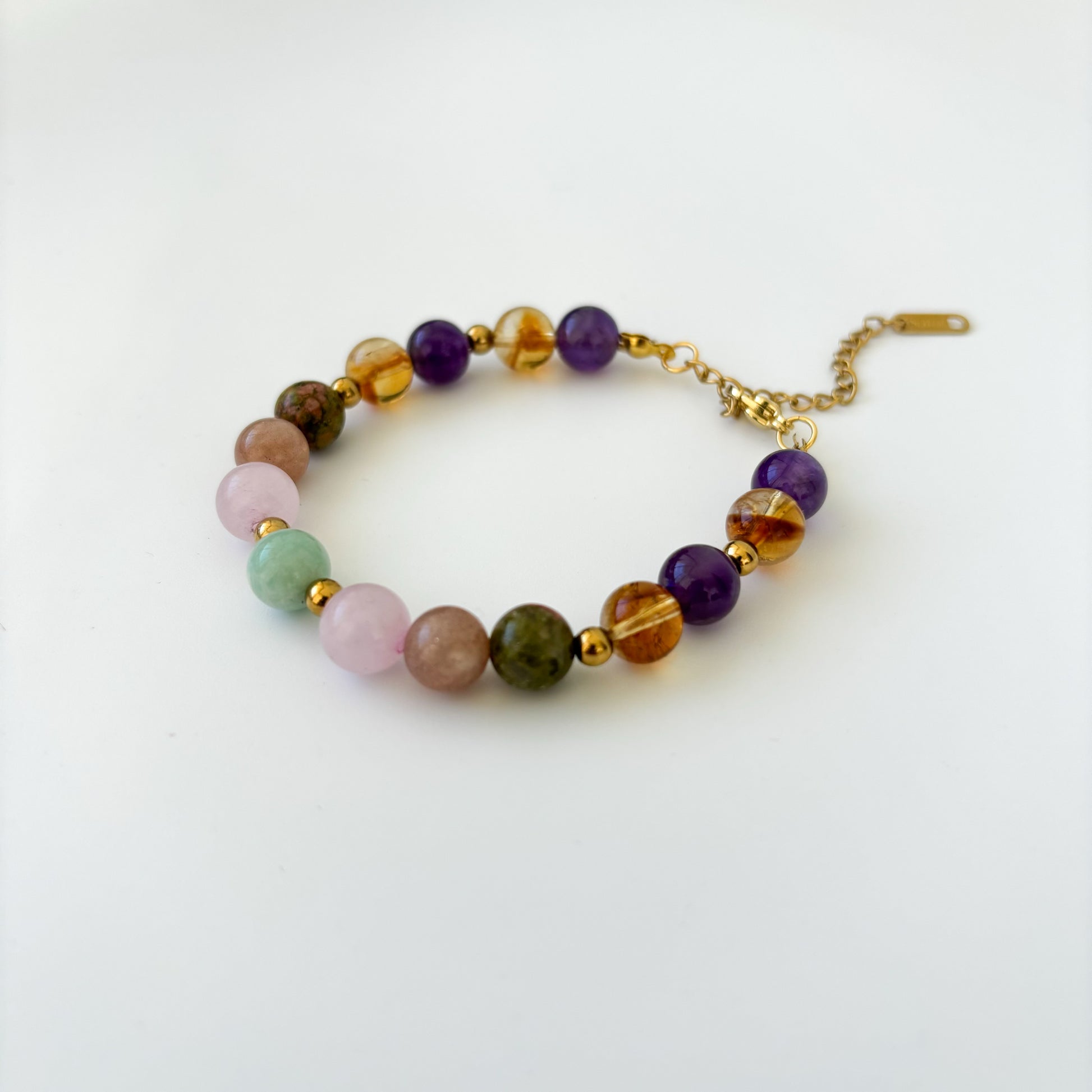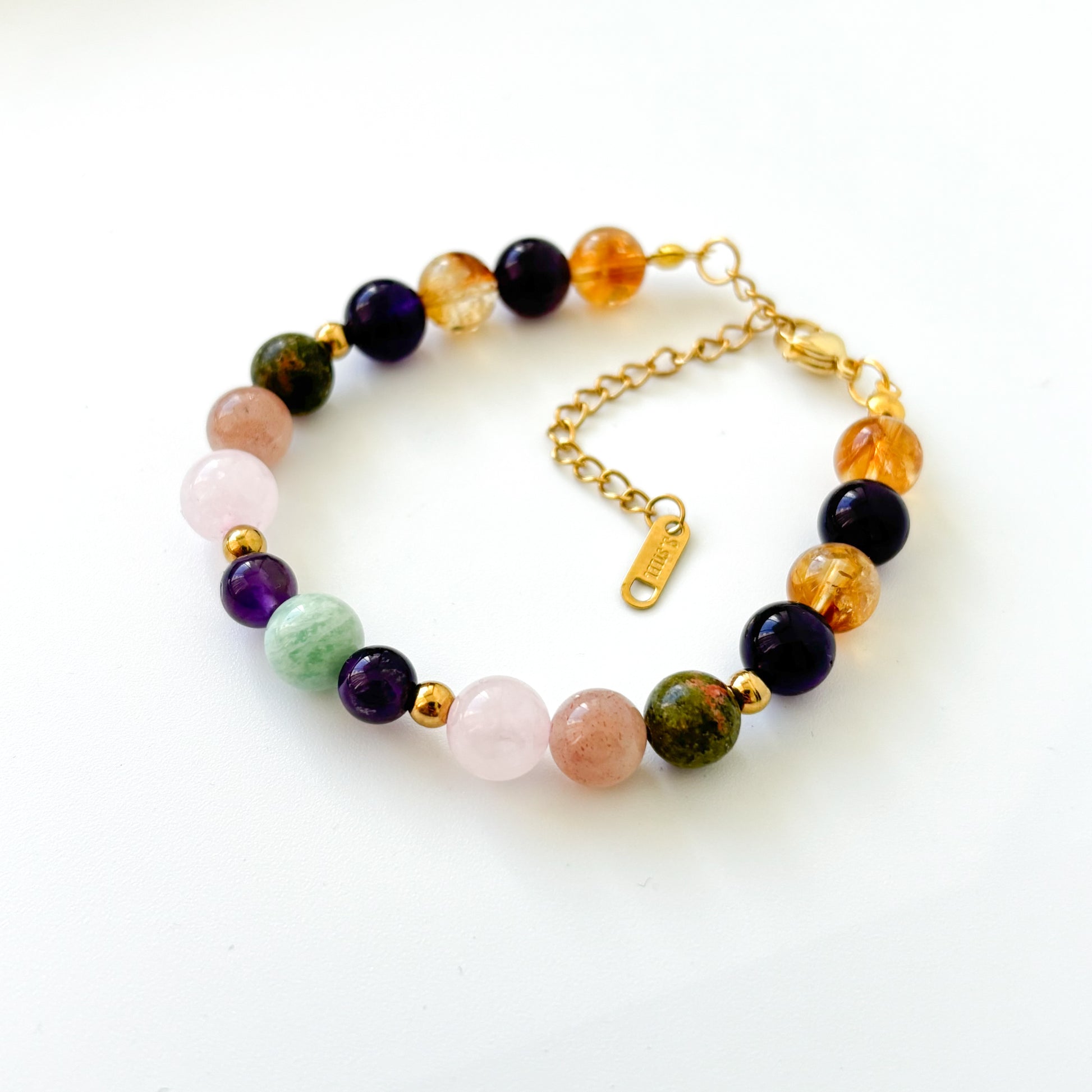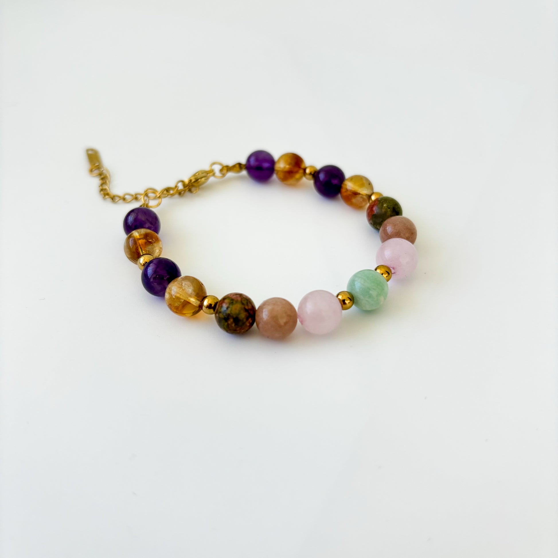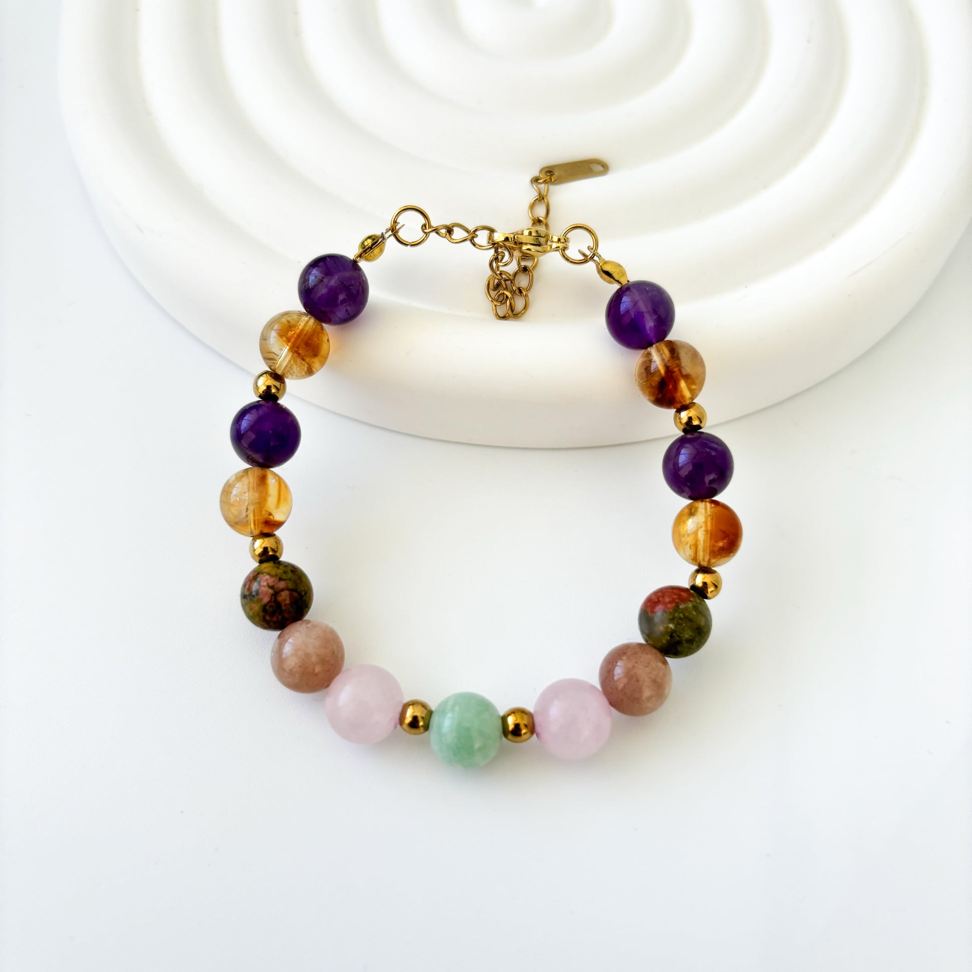 Doğal taşların büyüleyici enerjisiyle tasarlanan dişil enerji bilekliğimizle tanışın! Pembe Kuvars, Sitrin, Ametist, Unakit, Güneş Taşı ve Amazonit'in birleşimi, içsel gücünüzü ve zarafetinizi ortaya çıkaracak. Bu özel bileklik, dişil enerjiyi desteklerken, aynı zamanda denge ve huzur getirir. İşte bu bileklikte kullanılan taşların faydaları: