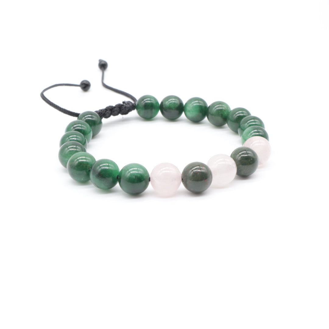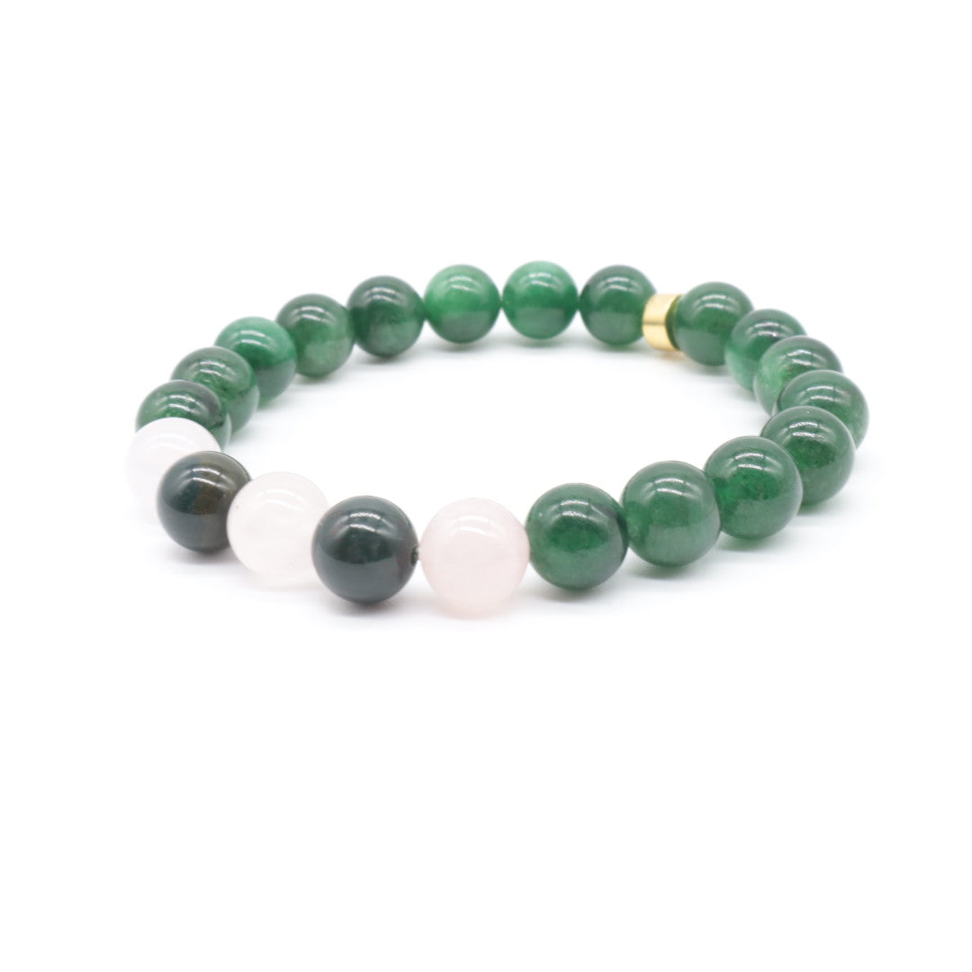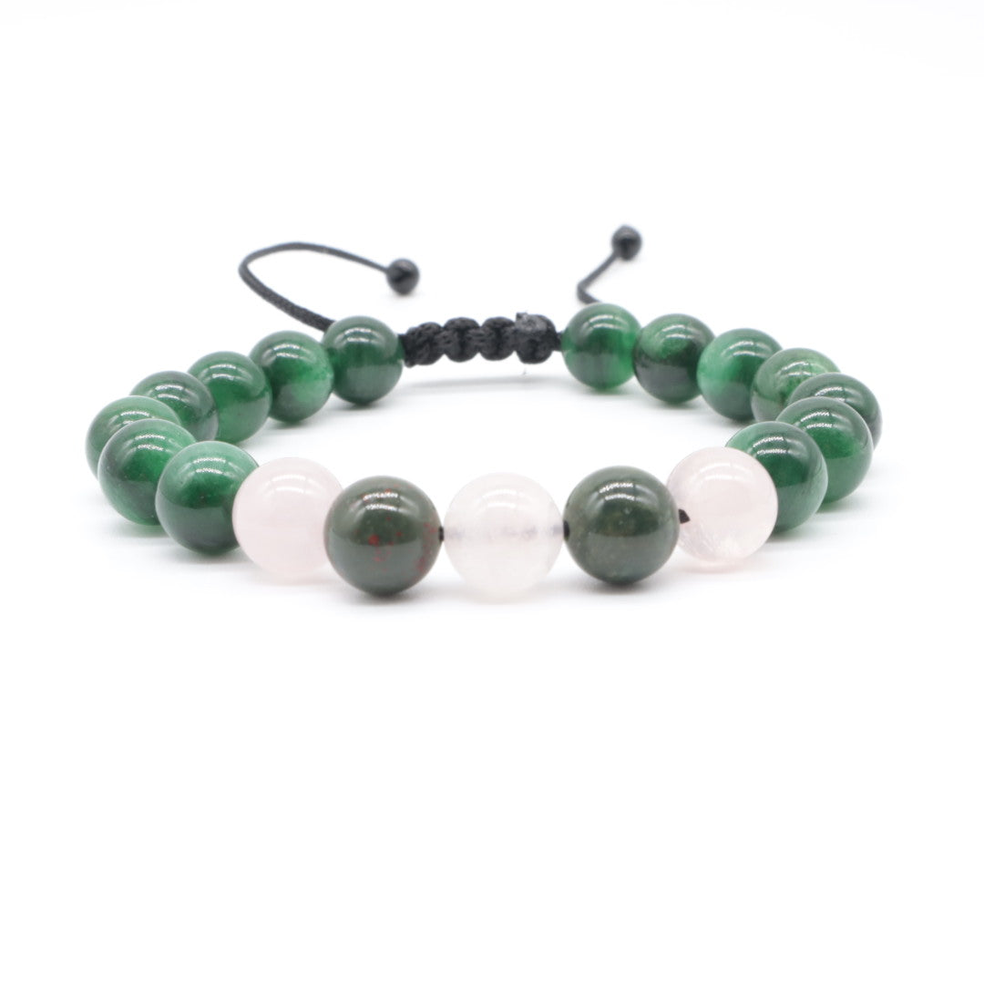 Bu özel bileklik, içsel sevgi ve denge arayan kadınlar için özel olarak tasarlanmıştır. Yeşim, kan taşı ve pembe kuvars gibi güçlü doğal taşların birleşimi, kalp çakrasını güçlendirmeye ve içsel sevgiyle dolu bir yaşamı teşvik etmeye yardımcı olur.