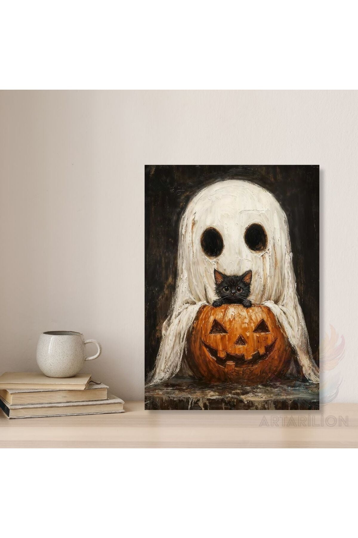 Sevimli Hayalet ve Küçük Siyah Kedi Cadılar Bayramı Temalı Kanvas Duvar Tablosu