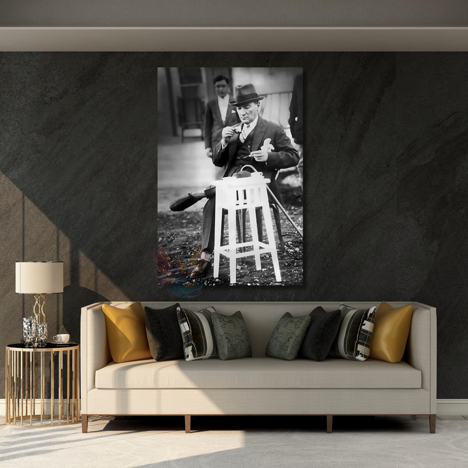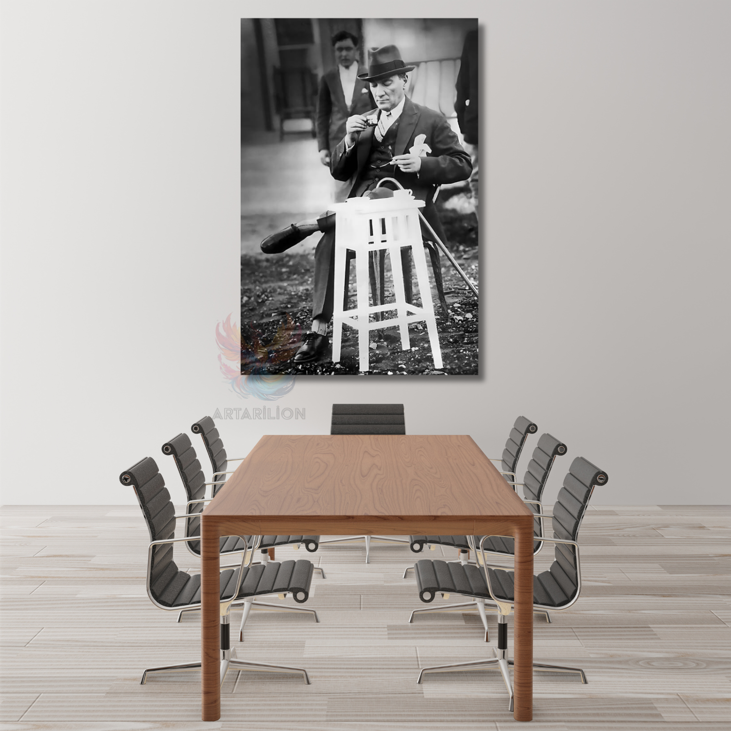 Siyah Beyaz Kahve İçen Atatürk Tablosu Kanvas Dijital Baskı Salon Ofis Tablosu