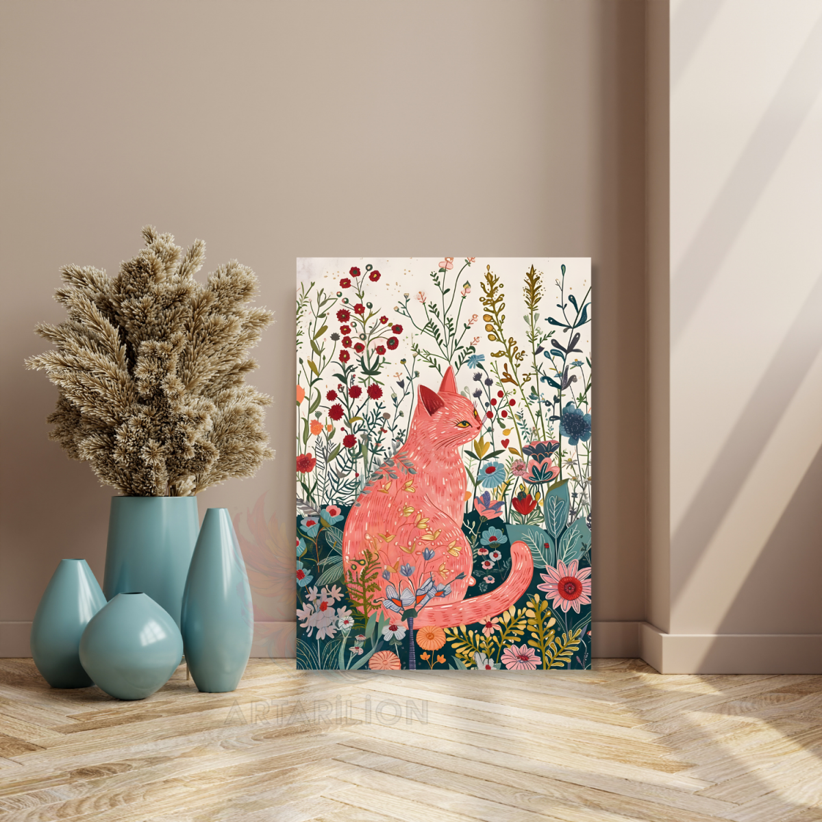Kanvas Tablo Çiçeklerin İçindeki Pembe Kedi Dijital Baskı Salon Tablosu
