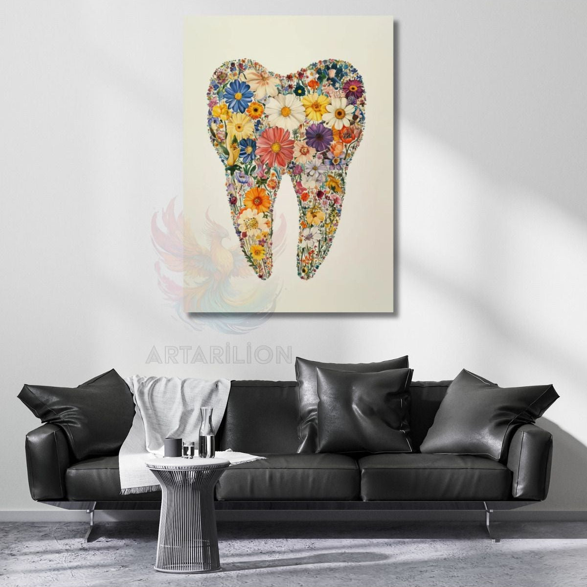 Kanvas Diş Muayene Tablosu Çiçekler ve Diş Tasarım Ofis Tablosu Diş Görseli Tablo