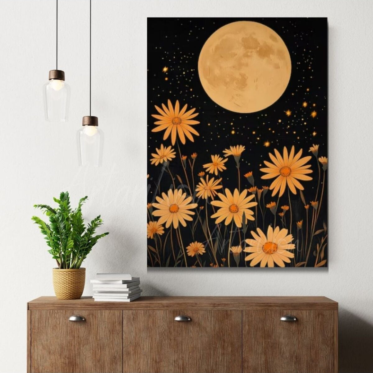 Kanvas Dijital HD Baskı Kanvas Tablo Dolunay ve Çiçekler Duvar Tablosu