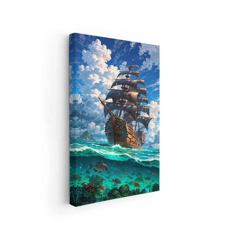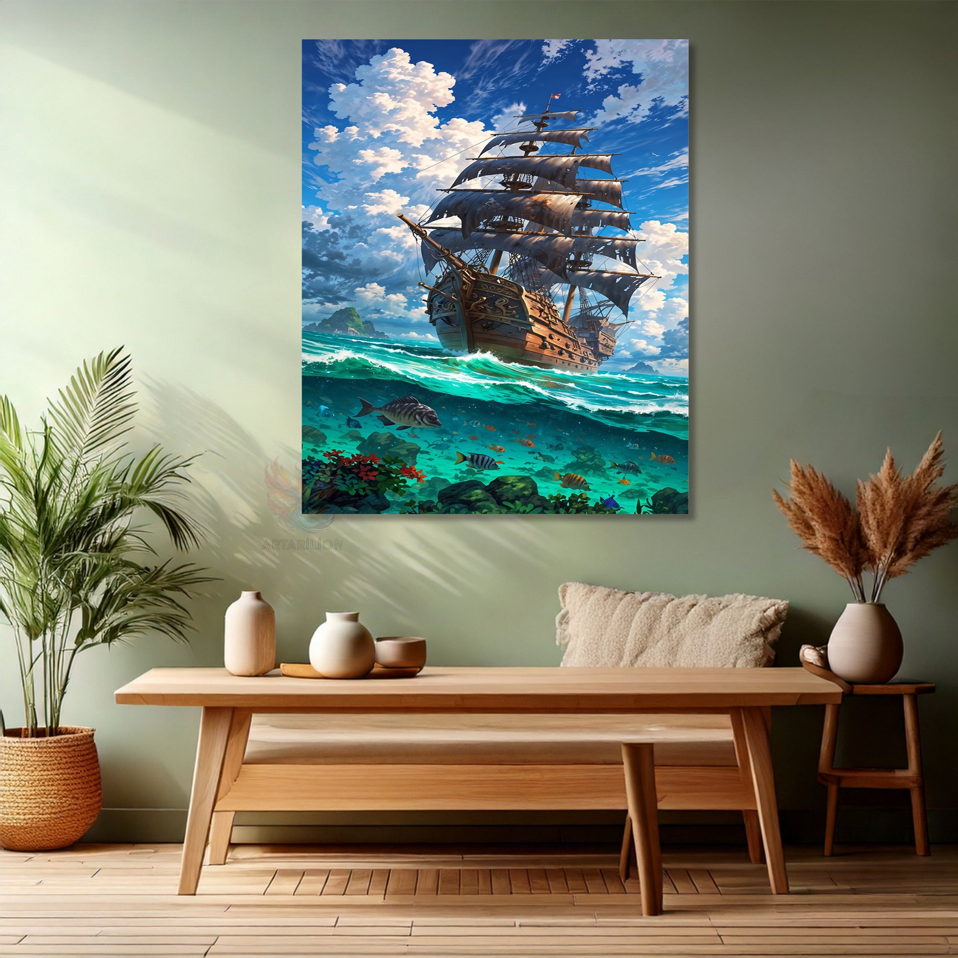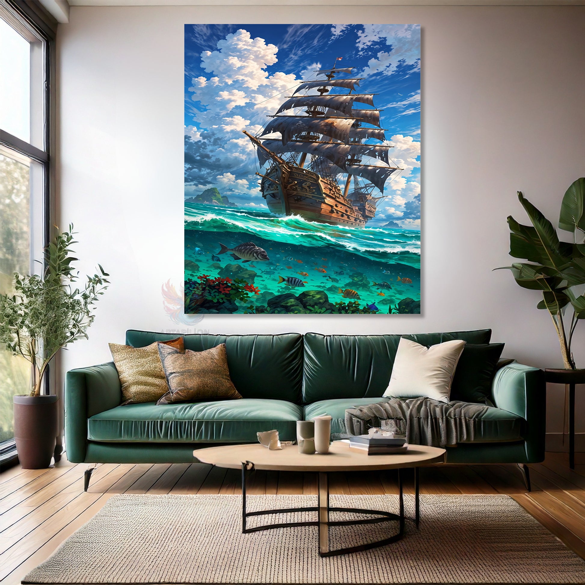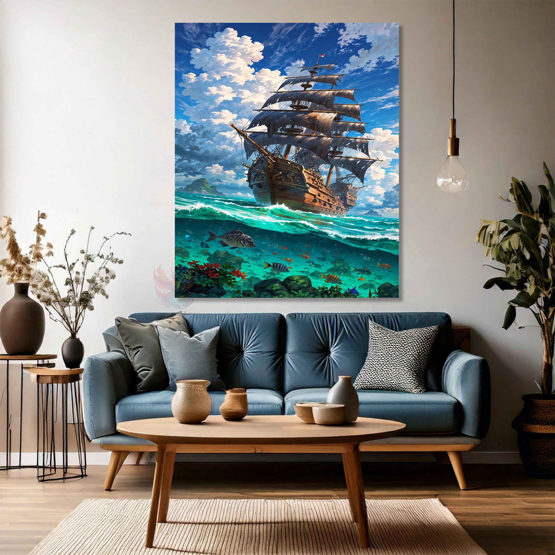 Kanvas Dikey Duvar Tablosu Kanvas Gemi ve Balıklar Ev Ofis Salon Modern Duvar Tablosu