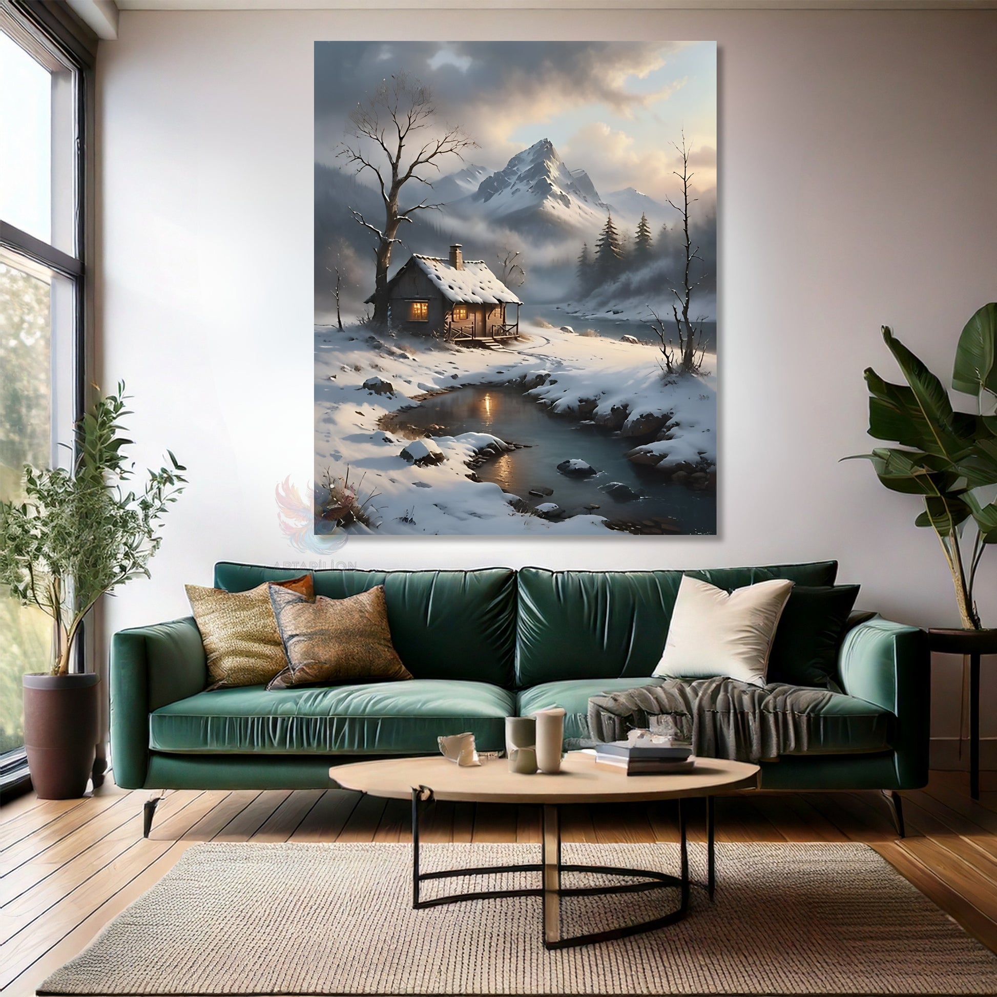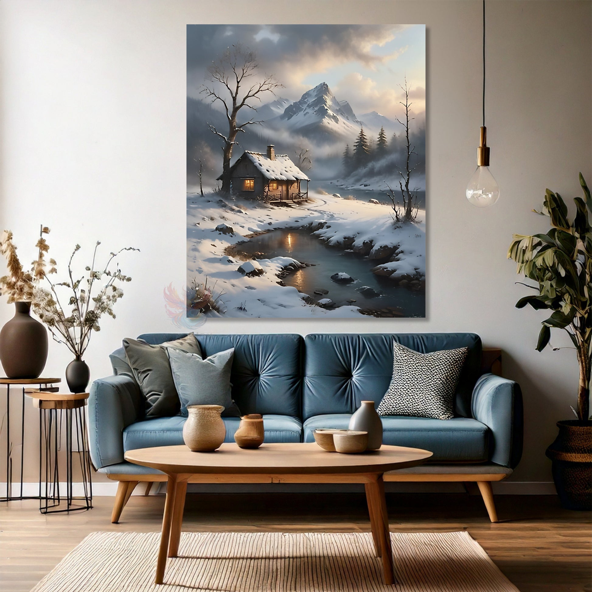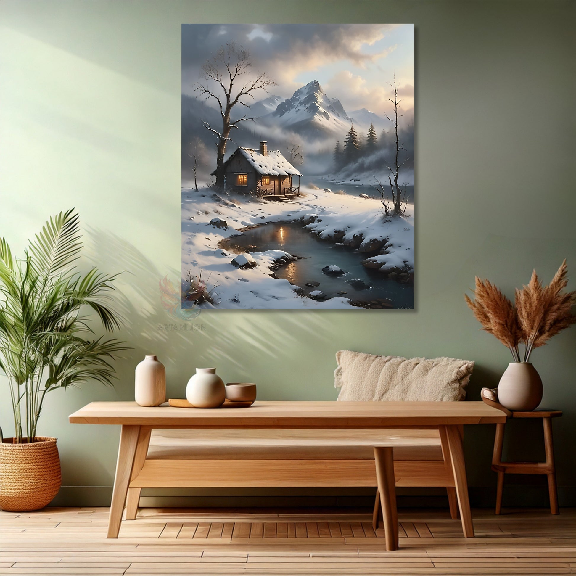 Kanvas Dikey Duvar Tablosu Kanvas Karlı Ev Dağ Manzarası Ev Ofis Salon Modern Duvar Tablosu