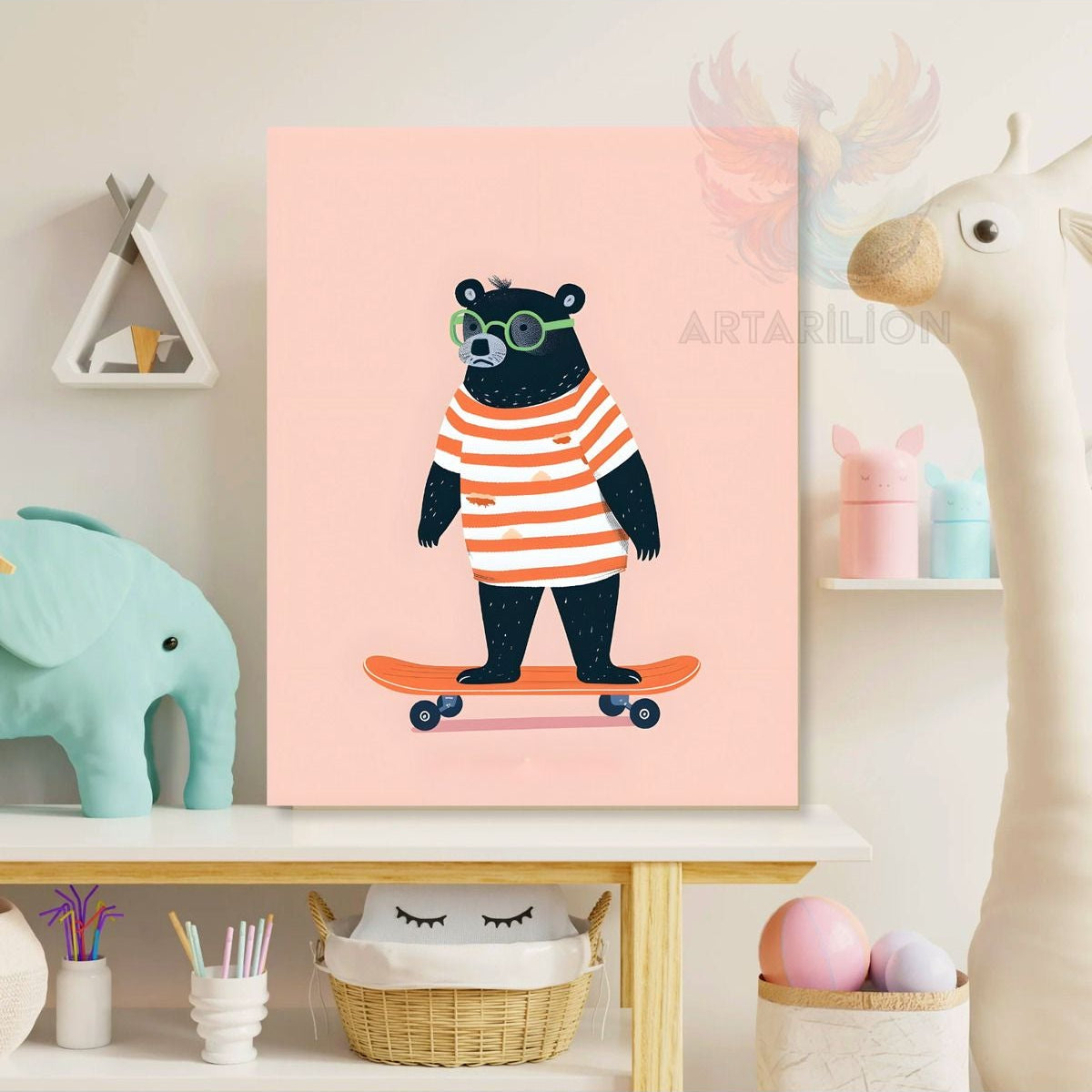 Kanvas Kaykaylı Ayı Desenli Baskı Tablo Oyun Odası Tablosu Duvar Dekoru Çocuk Odası Tablosu