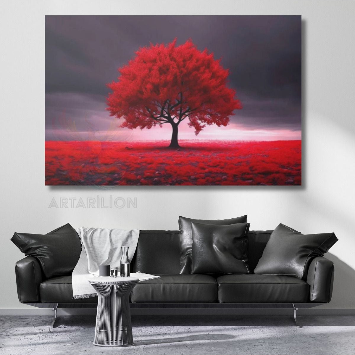 Kırmızı Ağaç Kanvas Manzara Tablosu Salon Tablosu Modern Tablo