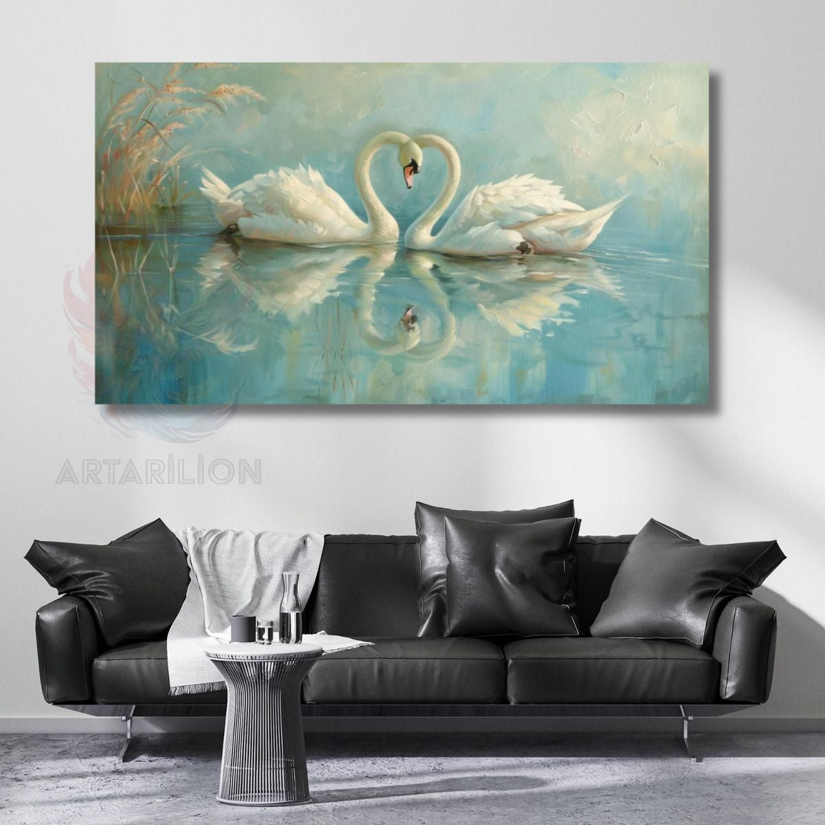Çifte Kuğular Beyaz Kuğular Kanvas Duvar Tablosu Yağlı Boya Görünümlü Tablo