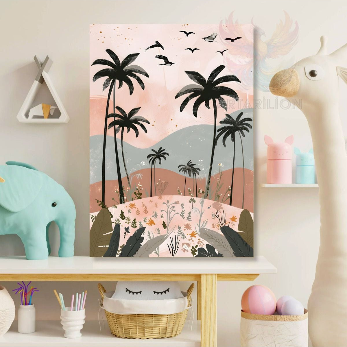 Kanvas Kuşlar Çiçekler ve Palmiyeler Desenli Baskı Tablo Duvar Dekoru Çocuk Odası Tablosu
