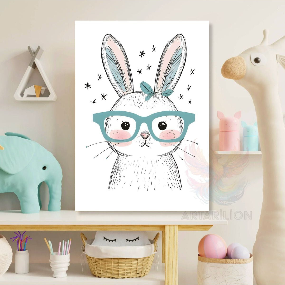 Kanvas Mavi Gözlüklü Sevimli Tavşan Baskı Tablo Oyun Odası Tablosu Çocuk Odası Tablosu