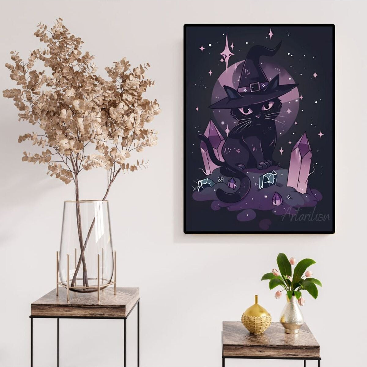 Kanvas Dijital HD Baskı Kanvas Tablo Cadı Şapkalı Siyah Kedi ve Kristaller Duvar Tablosu