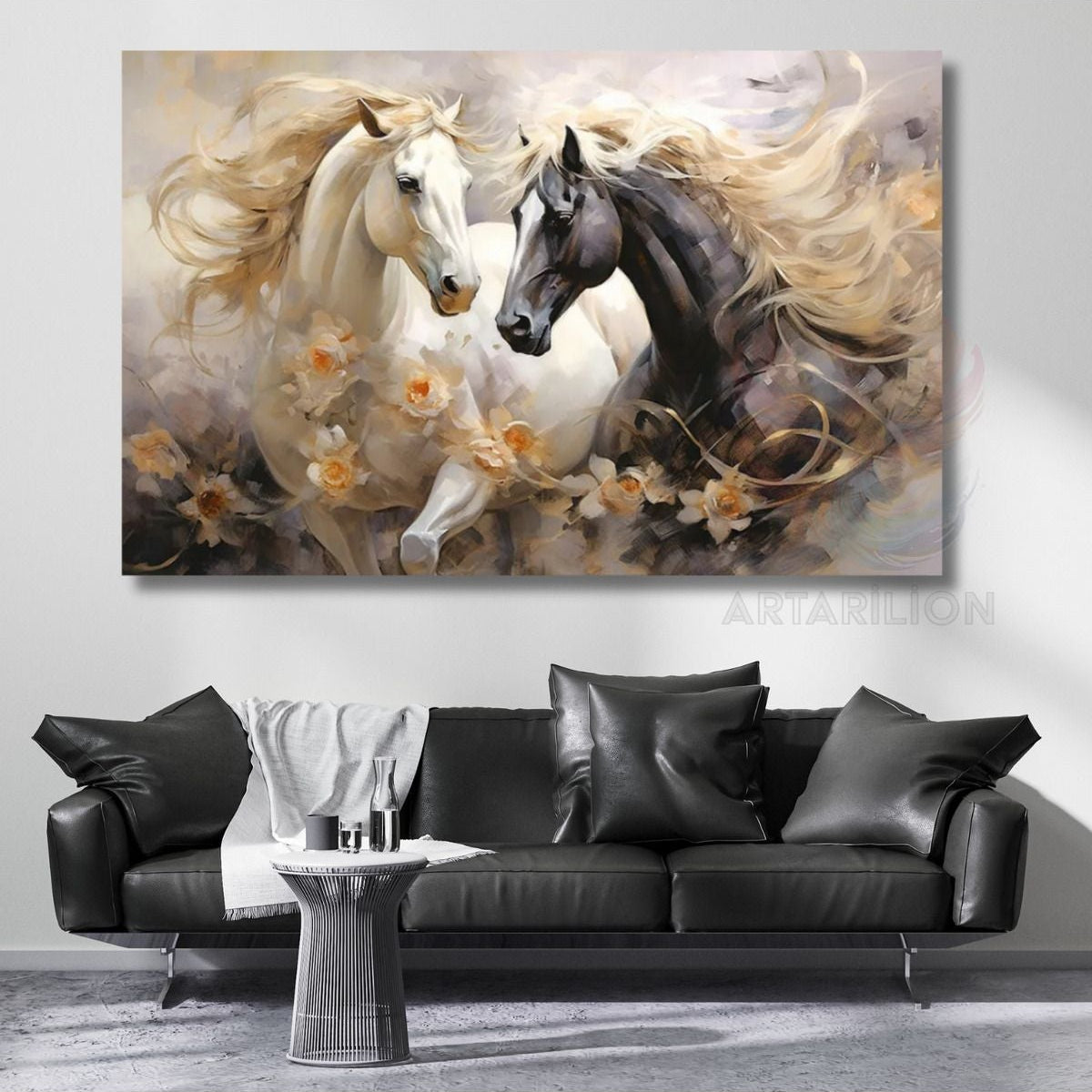 Siyah Beyaz At ve Çiçekler Kanvas Tablo Oturma Odası Tablosu Yeni Ev Hediyesi