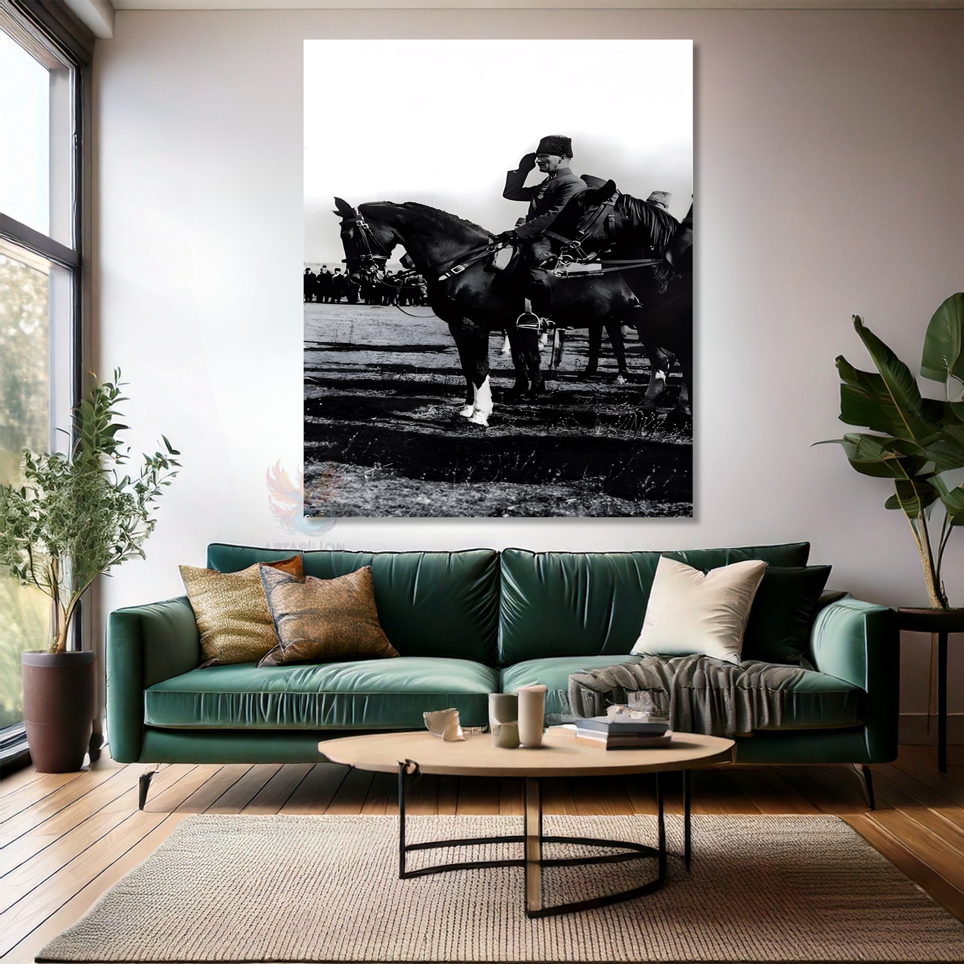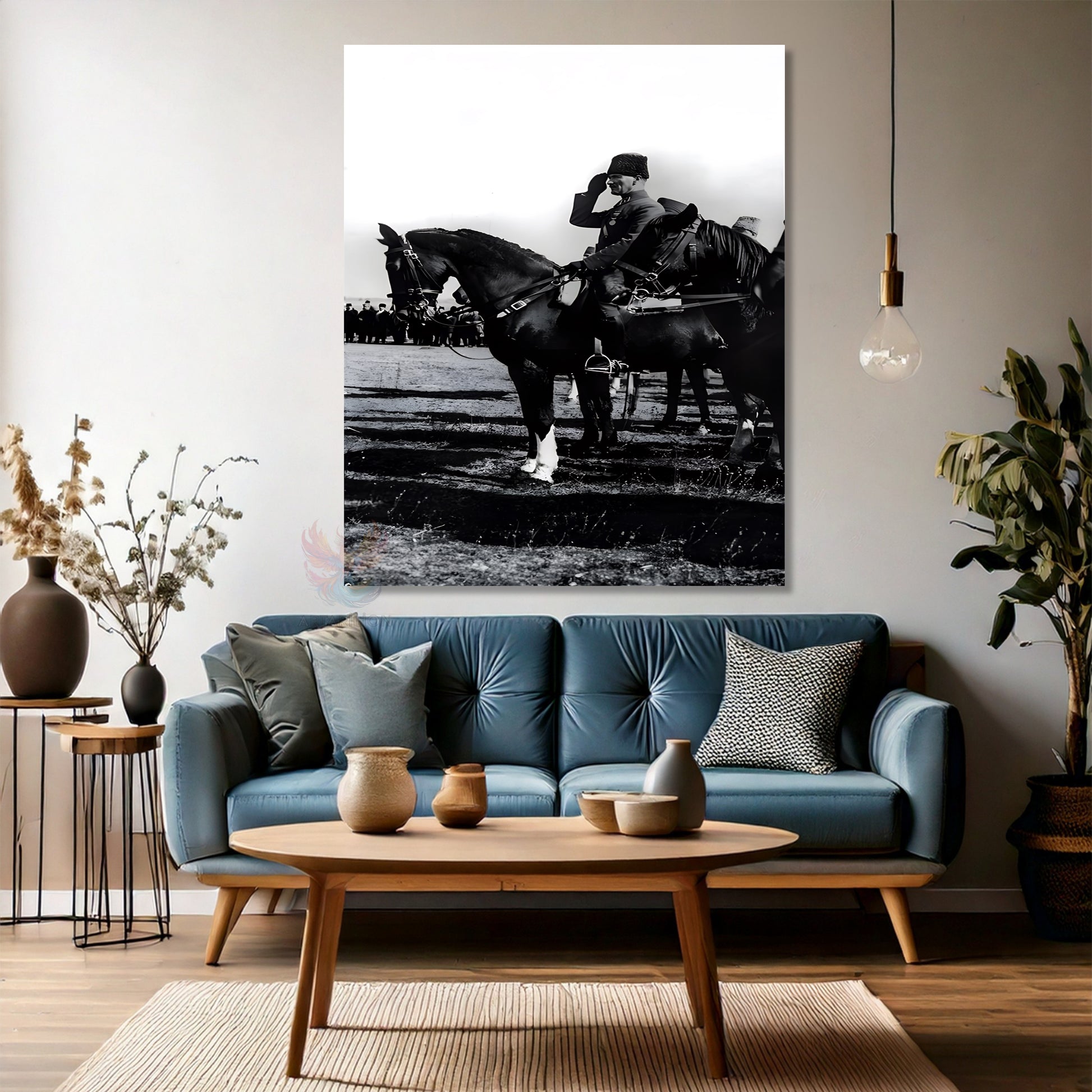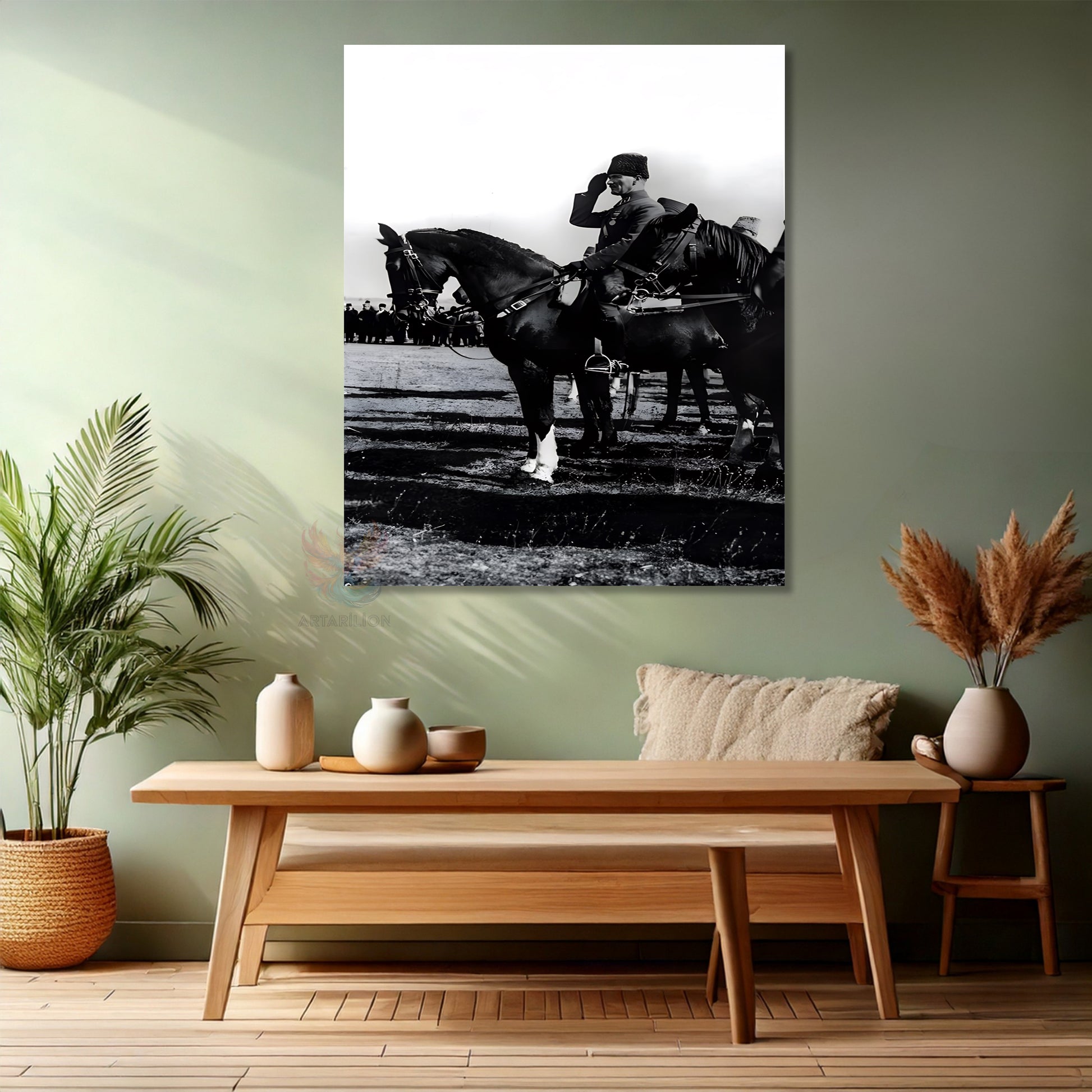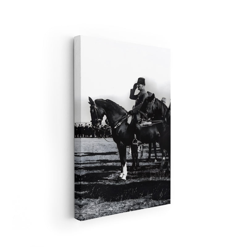 Kanvas Dikey Duvar Tablosu Kanvas Siyah Beyaz Atatürk At Üstünde Ev Ofis Salon Modern Duvar Tablosu