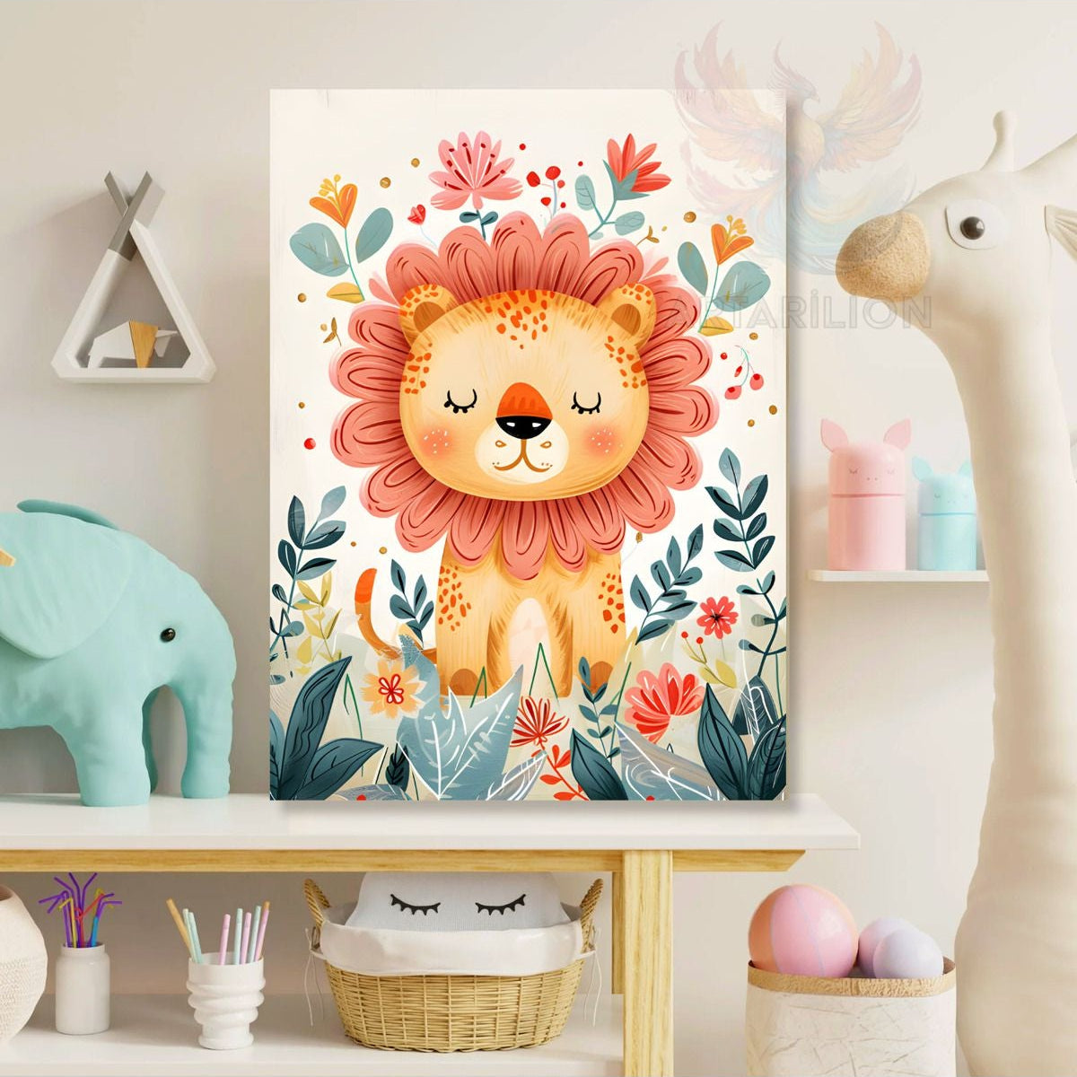 Kanvas Yavru Aslan ve Çiçekler Baskı Tablo Oyun Odası Tablosu Çocuk Odası Tablosu