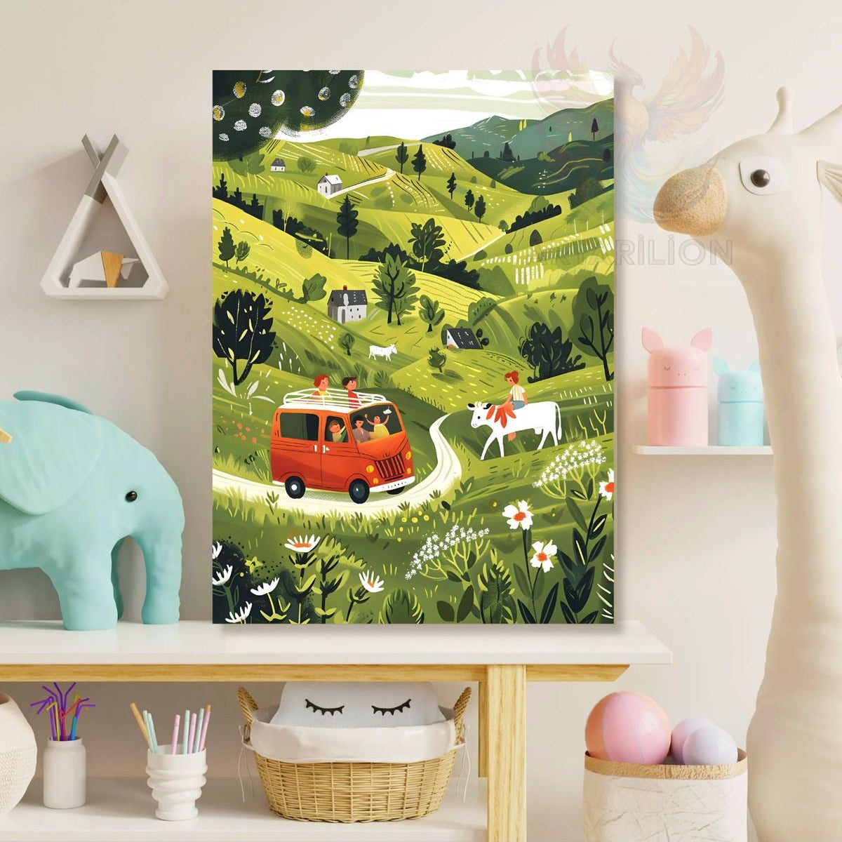 Kanvas Yeşil Doğa ve Kırmızı Araba Baskı Tablo Duvar Dekoru Çocuk Odası Tablosu